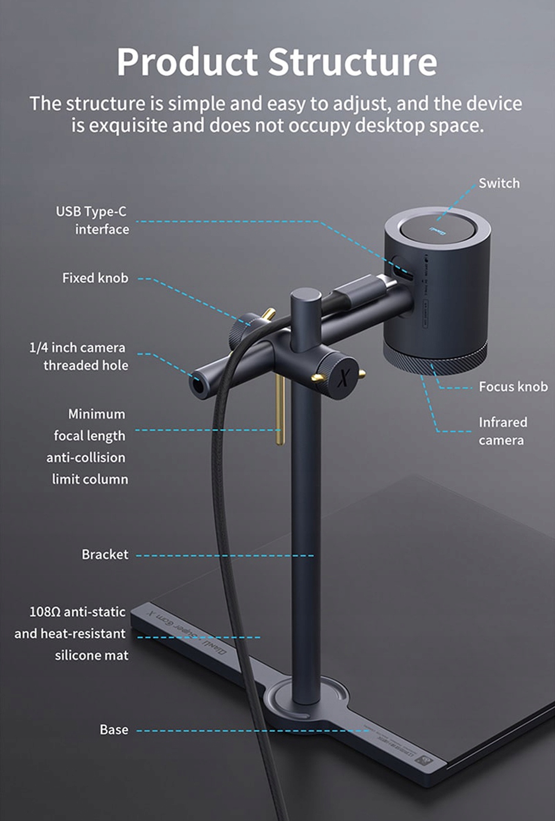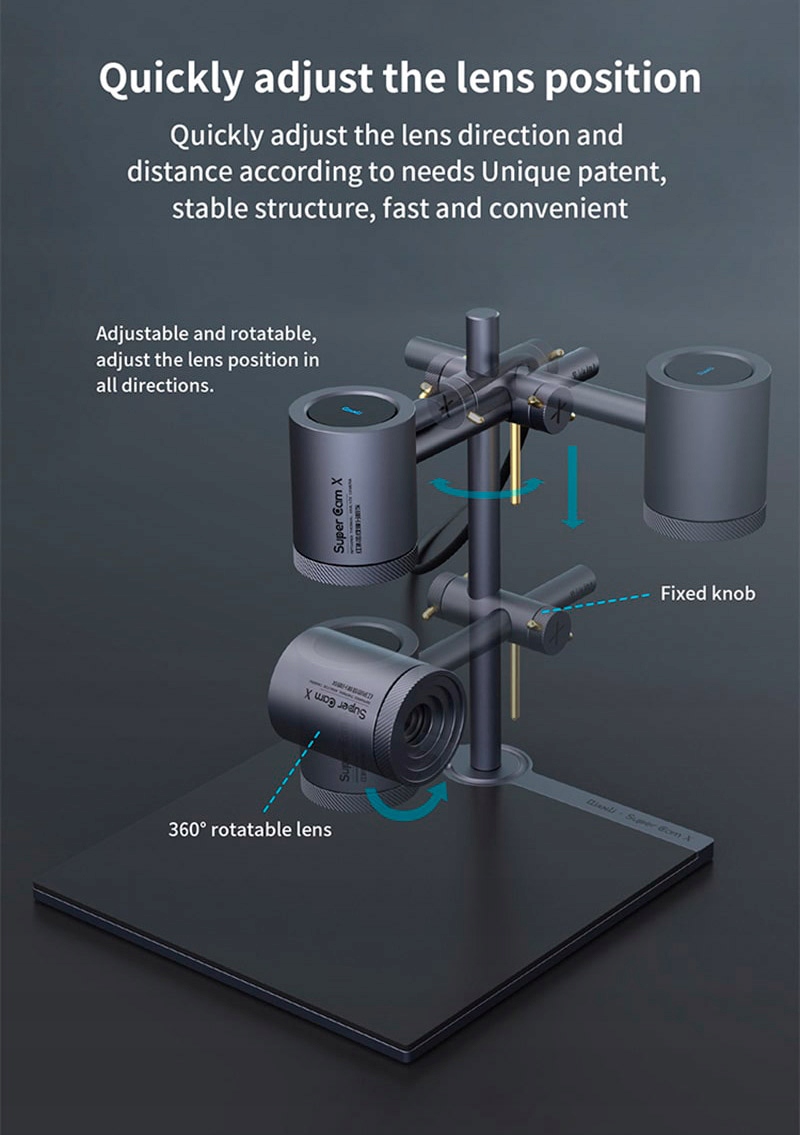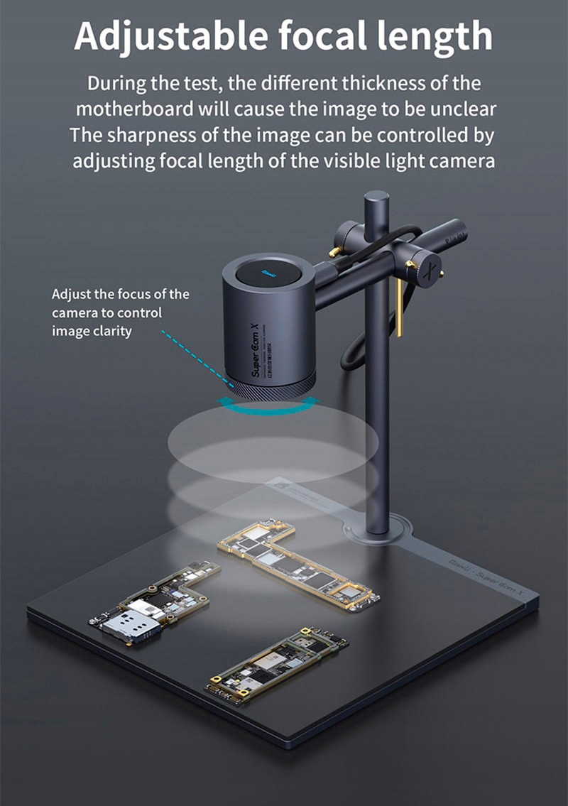 Aby osiągnąć najlepszą odległość obserwacji zestaw jest wyposażony w regulowany wysięgnik. Dostosowując odległość między urządzeniem a płytką drukowaną można dostosować obraz do wielkości badanej płytki drukowanej.