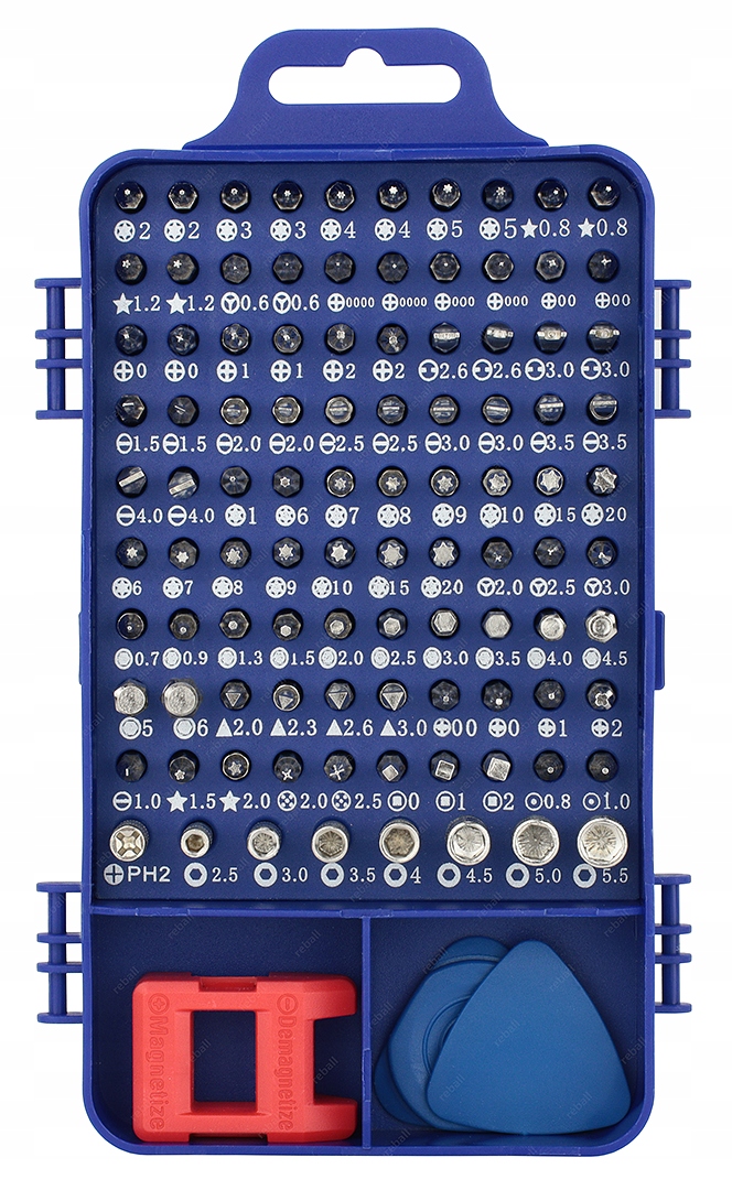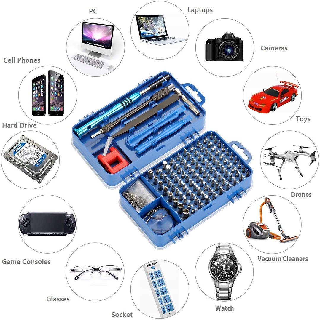RT0117 to zestaw 115 precyzyjnych narzędzi, bitów i otwieraków z lekkim aluminiowym uchwytem przeznaczony do precyzyjnych napraw serwisowych telefonów i smartfonów w tym produktów marki Apple oraz wszelkiej elektroniki konsumenckiej.