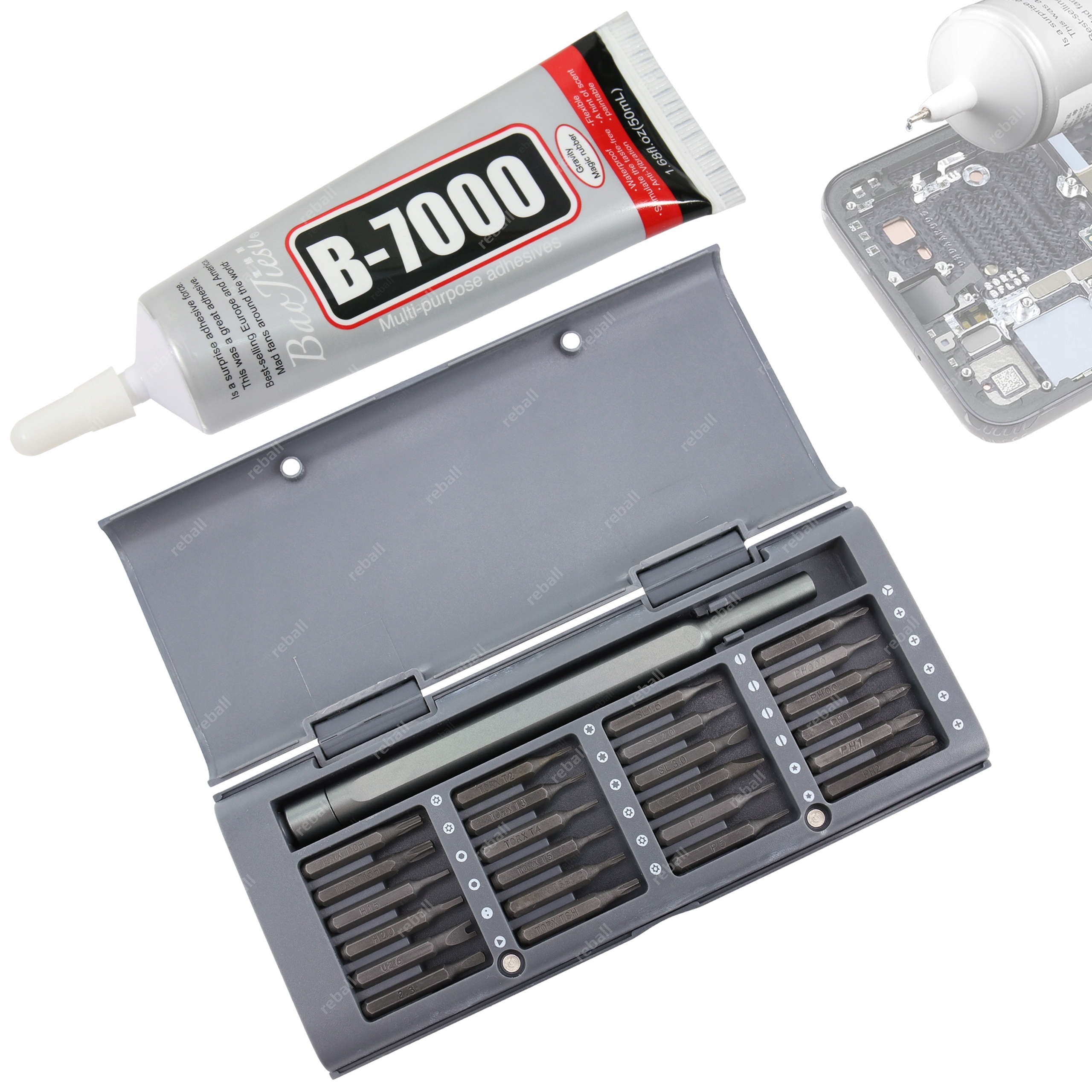 RT0104 to zestaw 24 magnetycznych bitów z aluminiowym uchwytem przeznaczony do precyzyjnych napraw serwisowych telefonów i smartfonów w tym produktów Samsung, Huawei, Xiaomi, Oppo oraz Apple tj iPhone, MacBook Air i Pro.