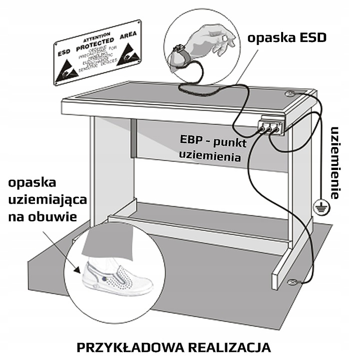 Widoczna na poniższym zdjęciu opaska uziemiająca na obuwie nie wchodzi w skład zestawu i znajduje się na naszych pozostałych aukcjach.