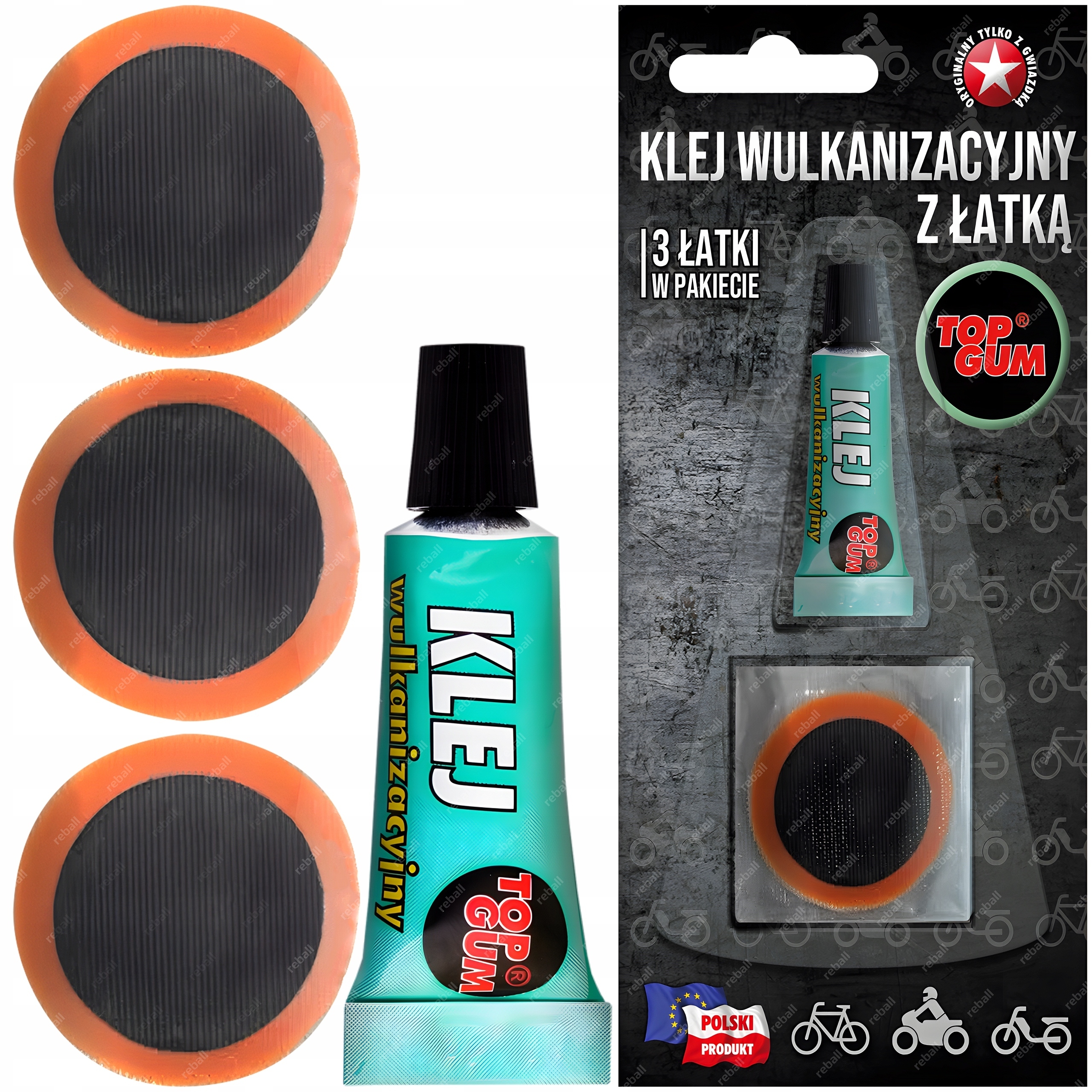 MOCNY KLEJ WULKANIZACYJNY TOPGUM + 3 ŁATKI BŁYSKAWICZNY DO GUMY OPONA DĘTKA