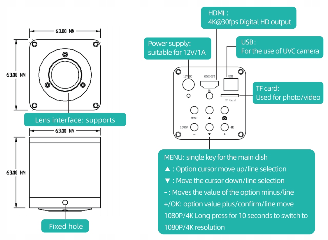 Cyfrowa kamera RF4 RF-4KC1 4K o rozdzielczości max. 3840x2160 30FPS z zaawansowanym oprogramowaniem do wymiarowania, pilotem, portami HDMI i USB oraz rejestracją obrazu i filmów na kartach microSD.