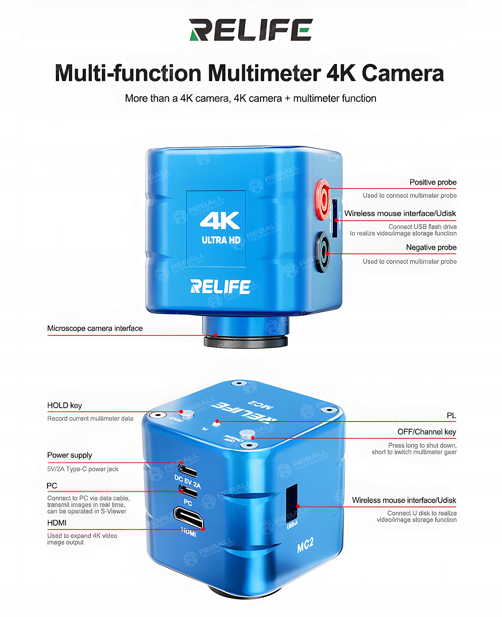 RELIFE MC2 to wielofunkcyjna kamera mikroskopowa 4K z wbudowaną funkcją multimetru, zaprojektowana do precyzyjnych prac serwisowych przy elektronice, płytach głównych i drobnych komponentach.