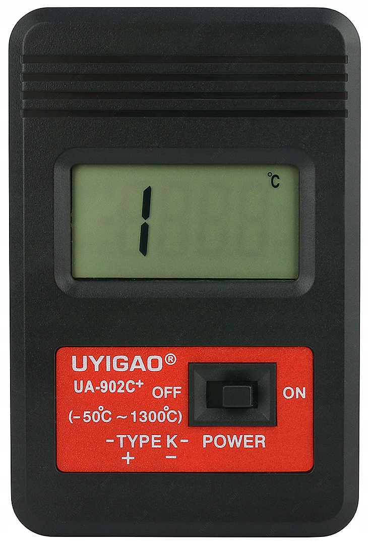 Cyfrowy miernik temperatury UA-902C+ umożliwia pomiar temperatury w zakresie -50°C - 1300°C z rozdzielczością 0,1°C do 1000°C i 1°C powyżej.