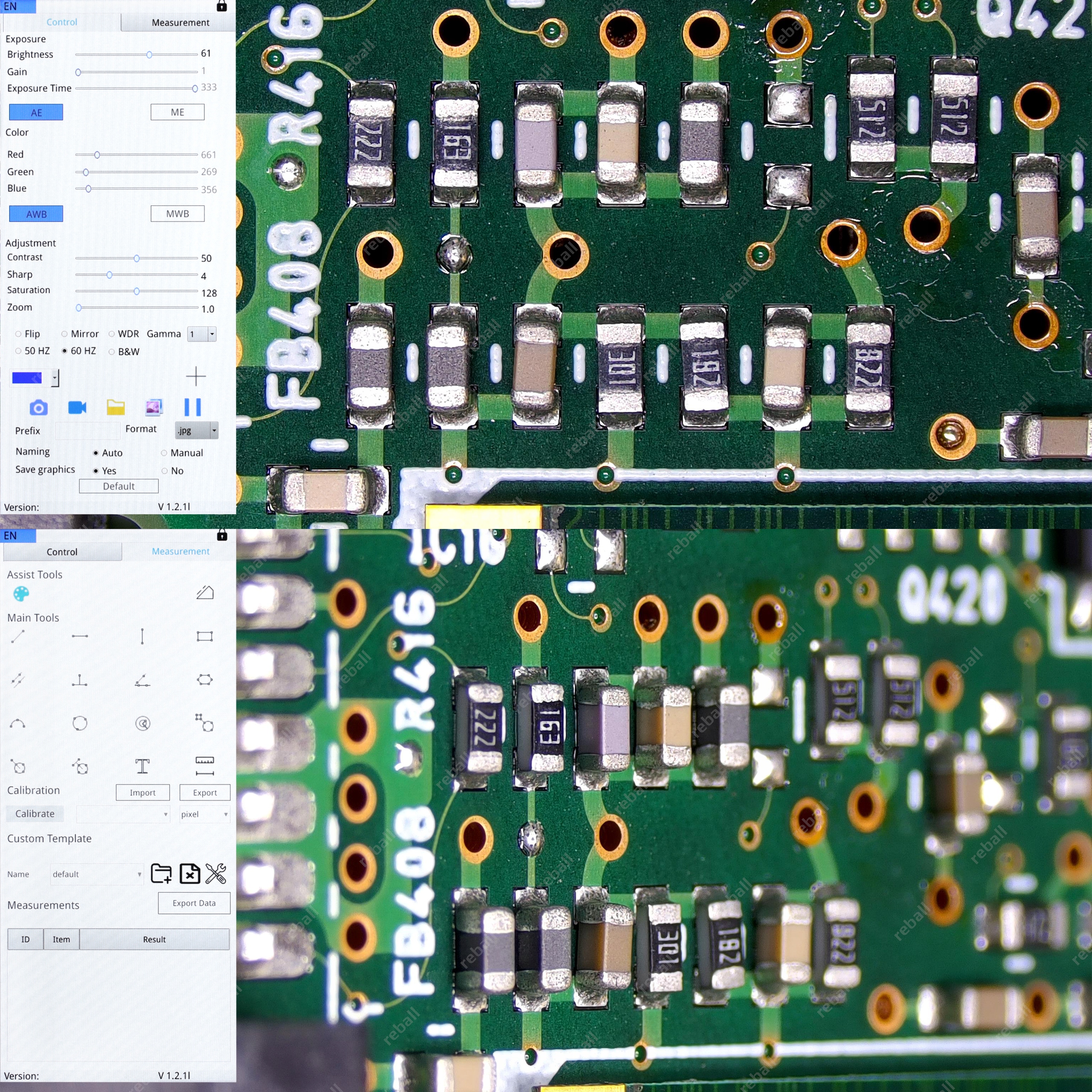 Oprogramowanie kamery posiada możliwość regulacji parametrów obrazu, włączenia skali jak i wymiarowania elementów oraz odległości między nimi.