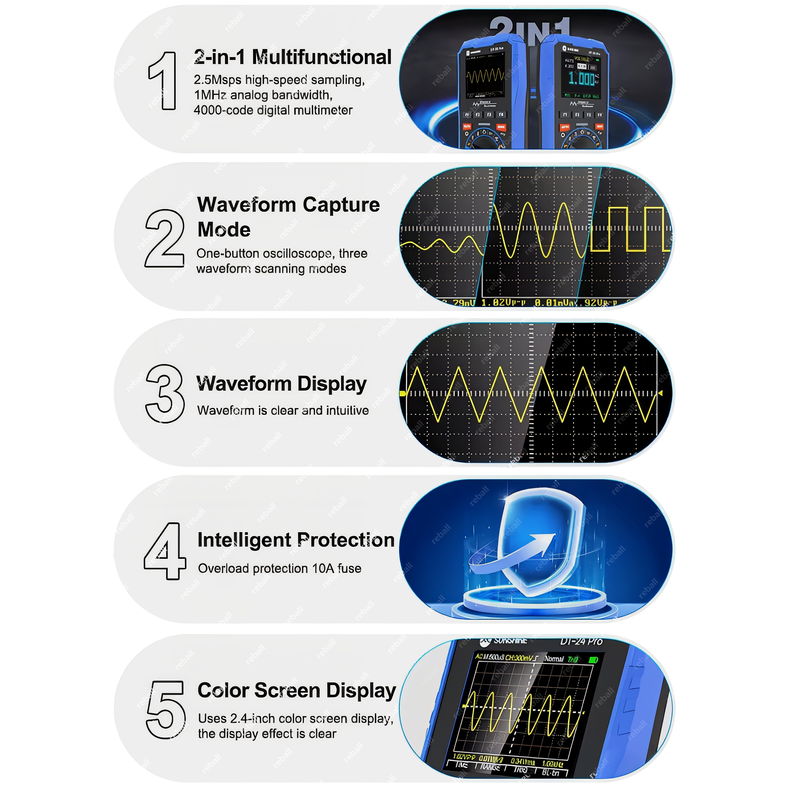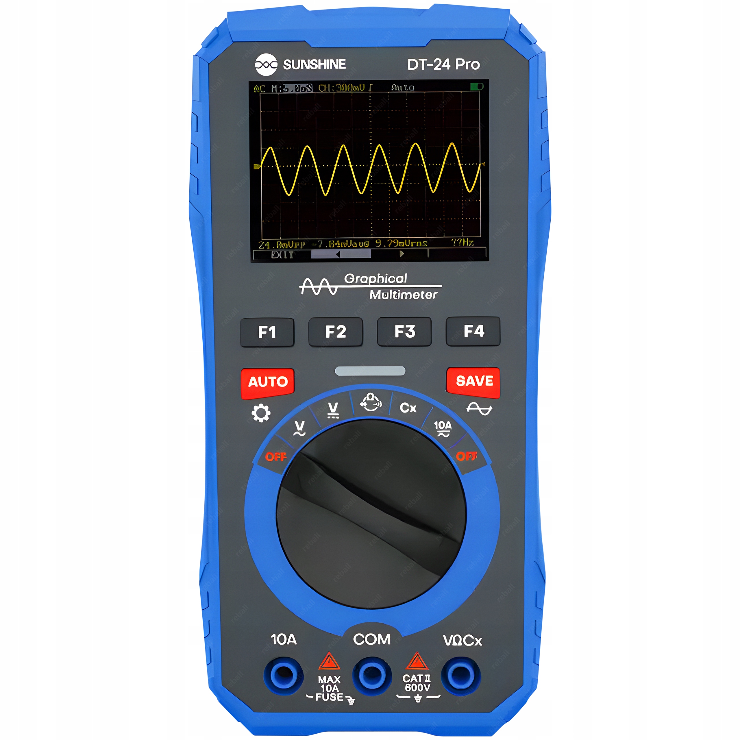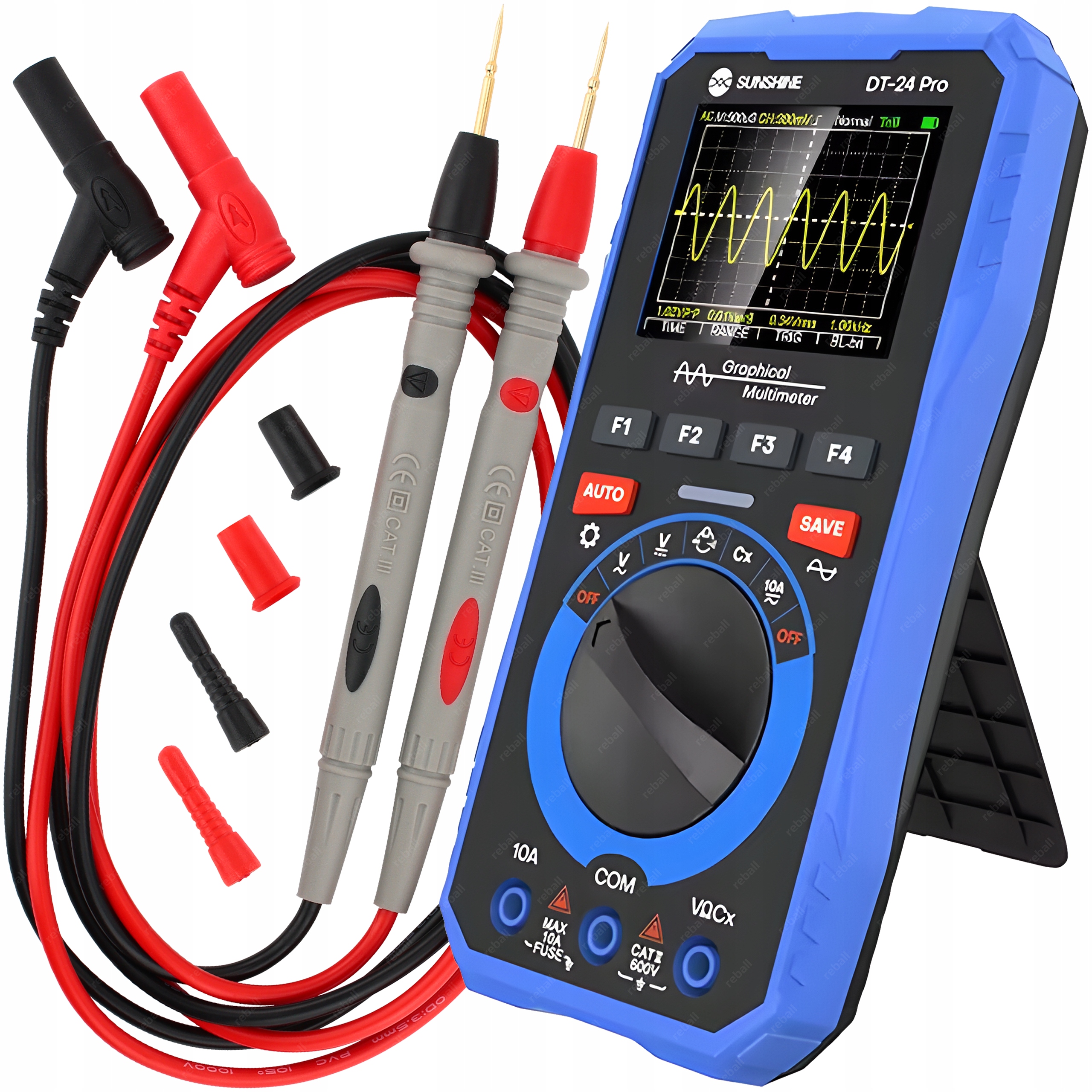 SUNSHINE DT-24 Pro to nowoczesne narzędzie pomiarowe łączące funkcjonalność multimetru cyfrowego oraz oscyloskopu, zaprojektowane z myślą o profesjonalistach zajmujących się elektroniką, serwisem urządzeń i diagnostyką układów.