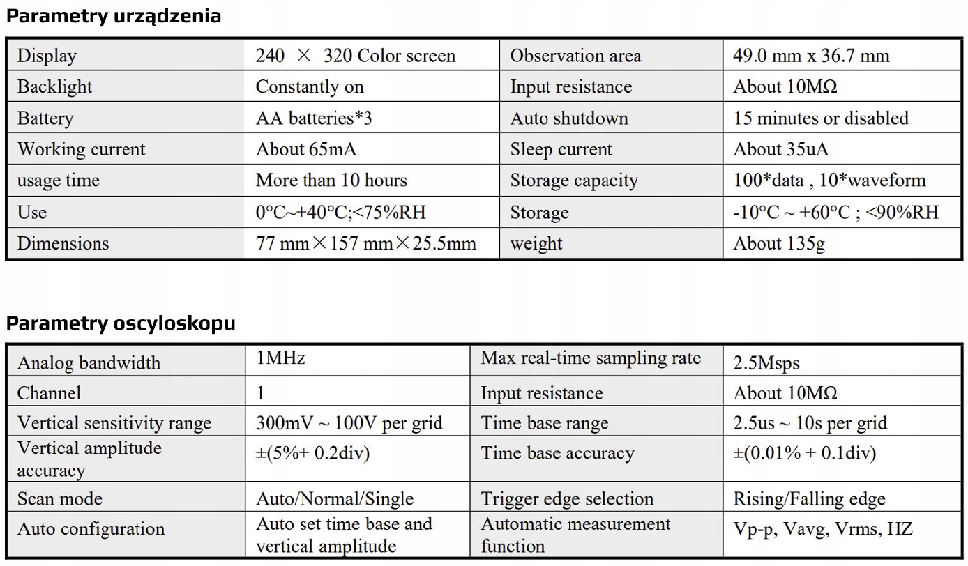 ✅ Funkcja 2 w 1 – połączenie multimetru (4000 kodów) i oscyloskopu z próbkowaniem 2,5 Msps i pasmem analogowym 1 MHz