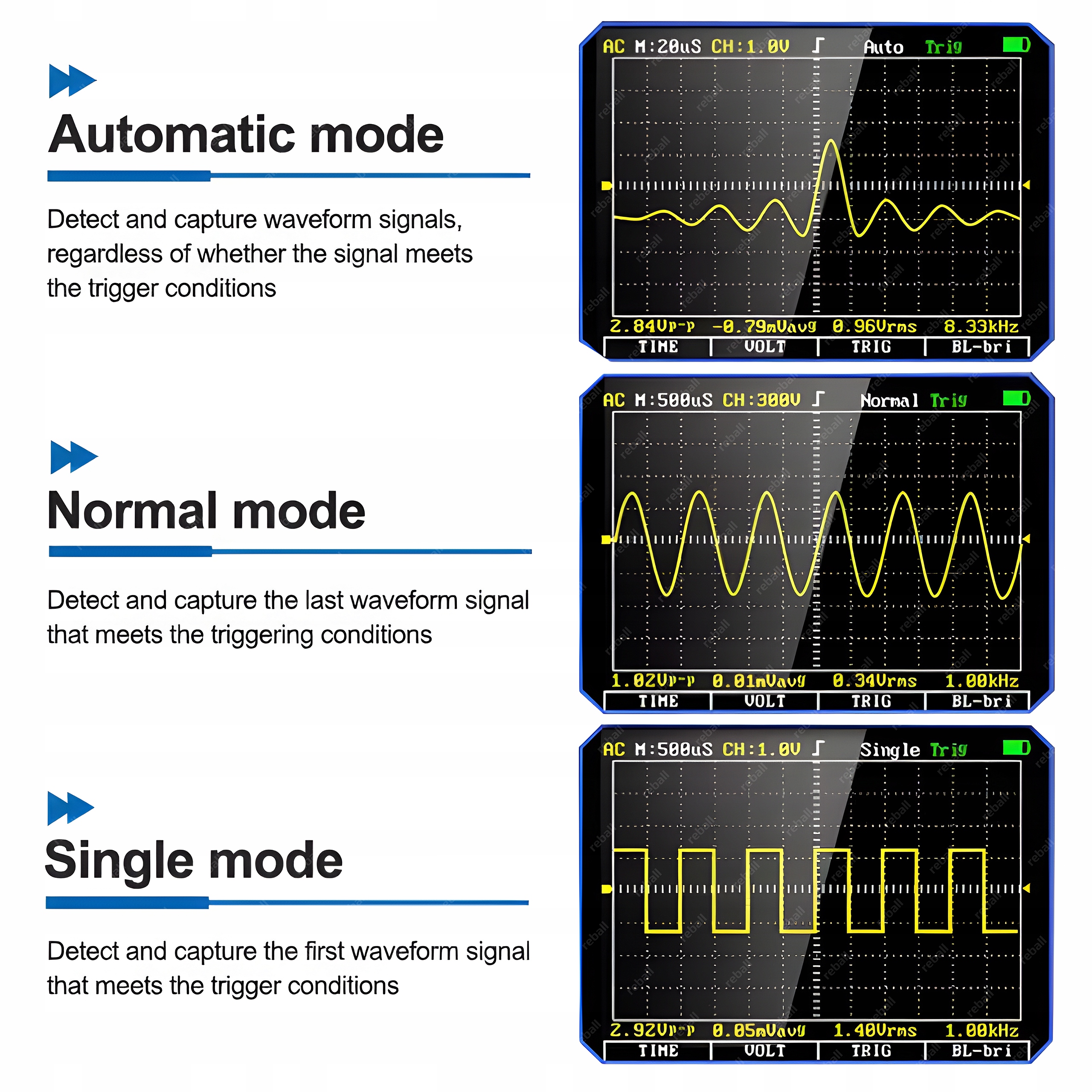 ✅ Jednoprzyciskowe przechwytywanie przebiegów – trzy tryby (auto, normalny, pojedynczy) do rejestracji sygnałów bez skomplikowanych ustawień