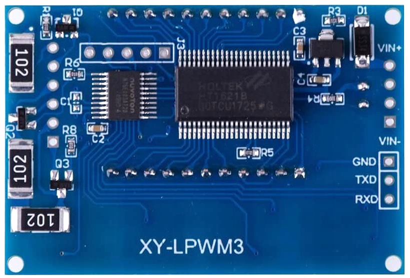 Moduł posiada dwu segmentowy czytelny wyświetlacz LCD oraz możliwość komunikacji szeregowej przez złącze RS232 TTL (GND, TXD, RXD). Zaopatrując się dodatkowo w konwerter USB UART TTL możemy łatwo z poziomu terminalna sterować parametrami XY-LPWM3
