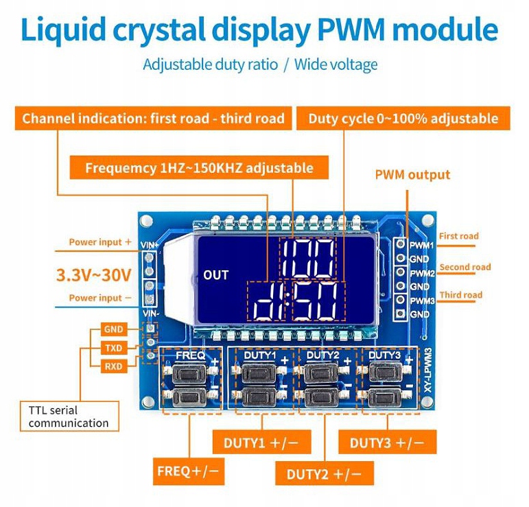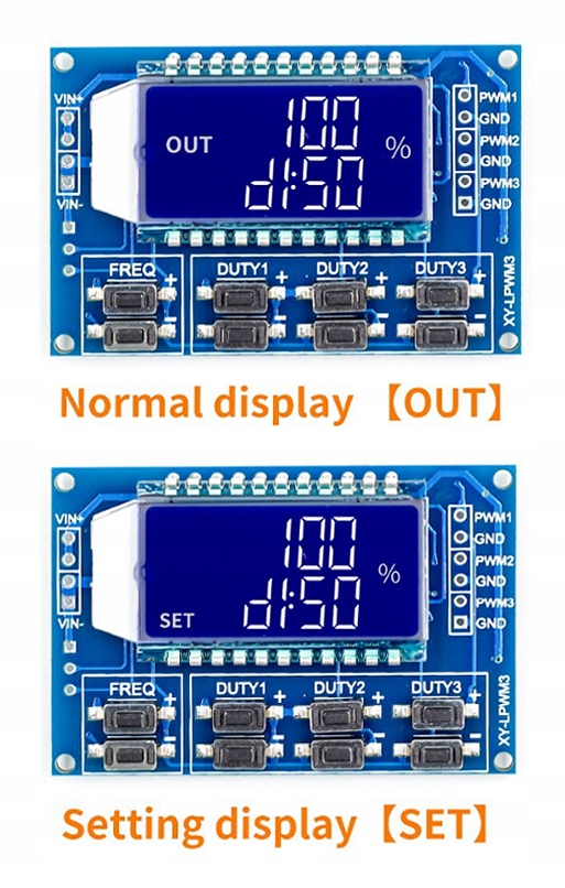 XY-LPWM3 to 3-kanałowy moduł generatora sygnału PWM z regulacją częstotliwości oraz wypełnienia impulsów przebiegu prostokątnego.