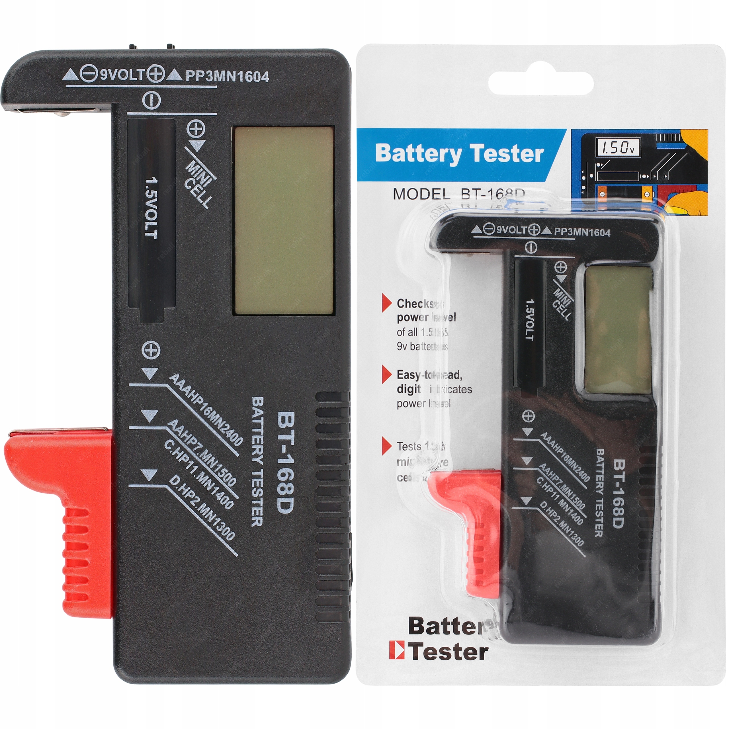 Urządzenie umożliwia szybkie i wygodne sprawdzenie poziomu naładowania różnych rodzajów baterii i akumulatorów, w tym: AA (R6), AAA (R3), R14, R20, baterie pastylkowe 1,5V, baterie 9V (R9) oraz ogniwa 18650.