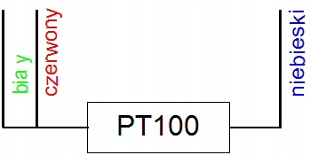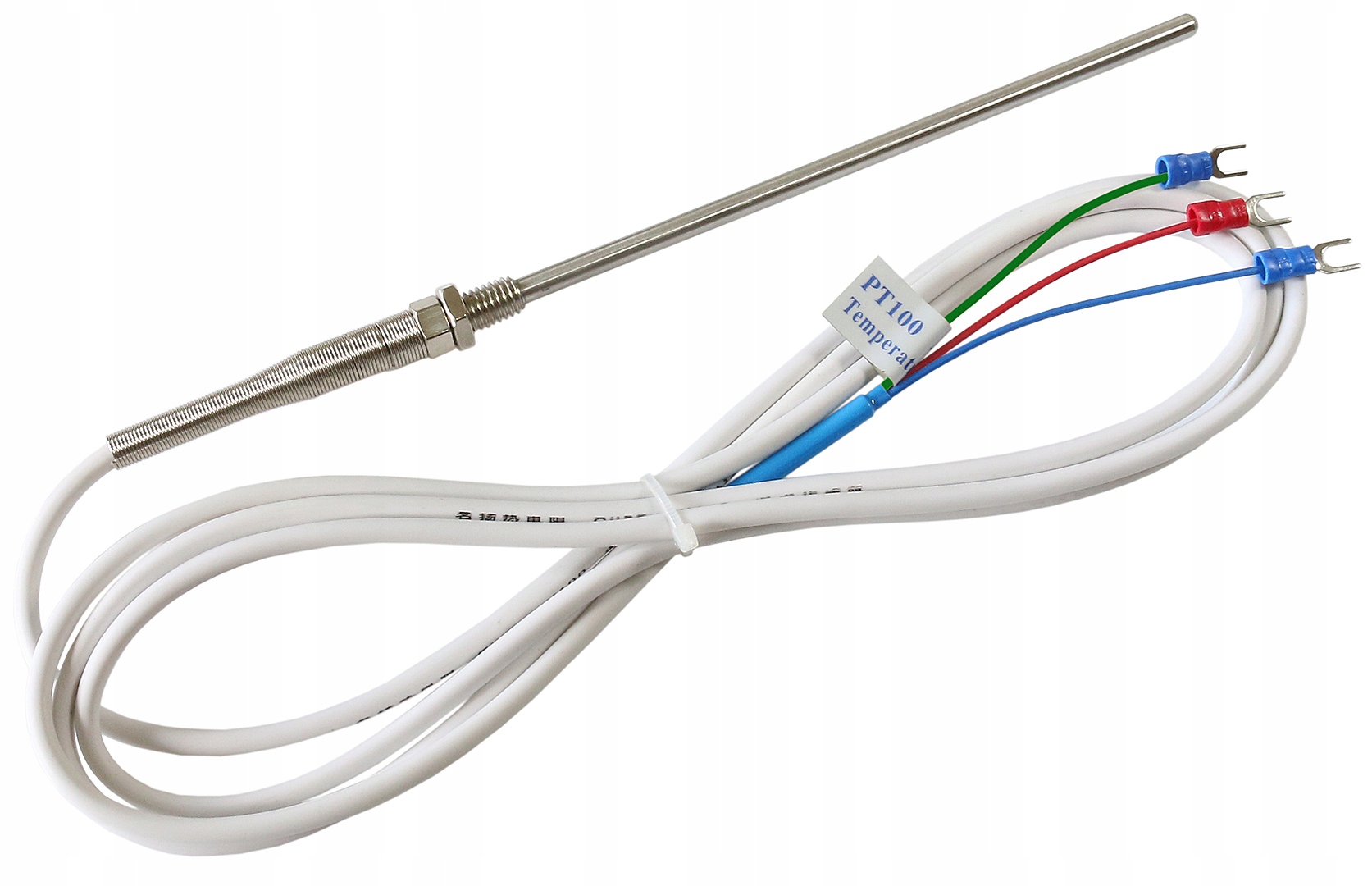 Czujnik temperatury PT100 umieszczony wewnątrz osłony ze stali nierdzewnej zakończonej gwintem M8 z przewodem o długości 2m.