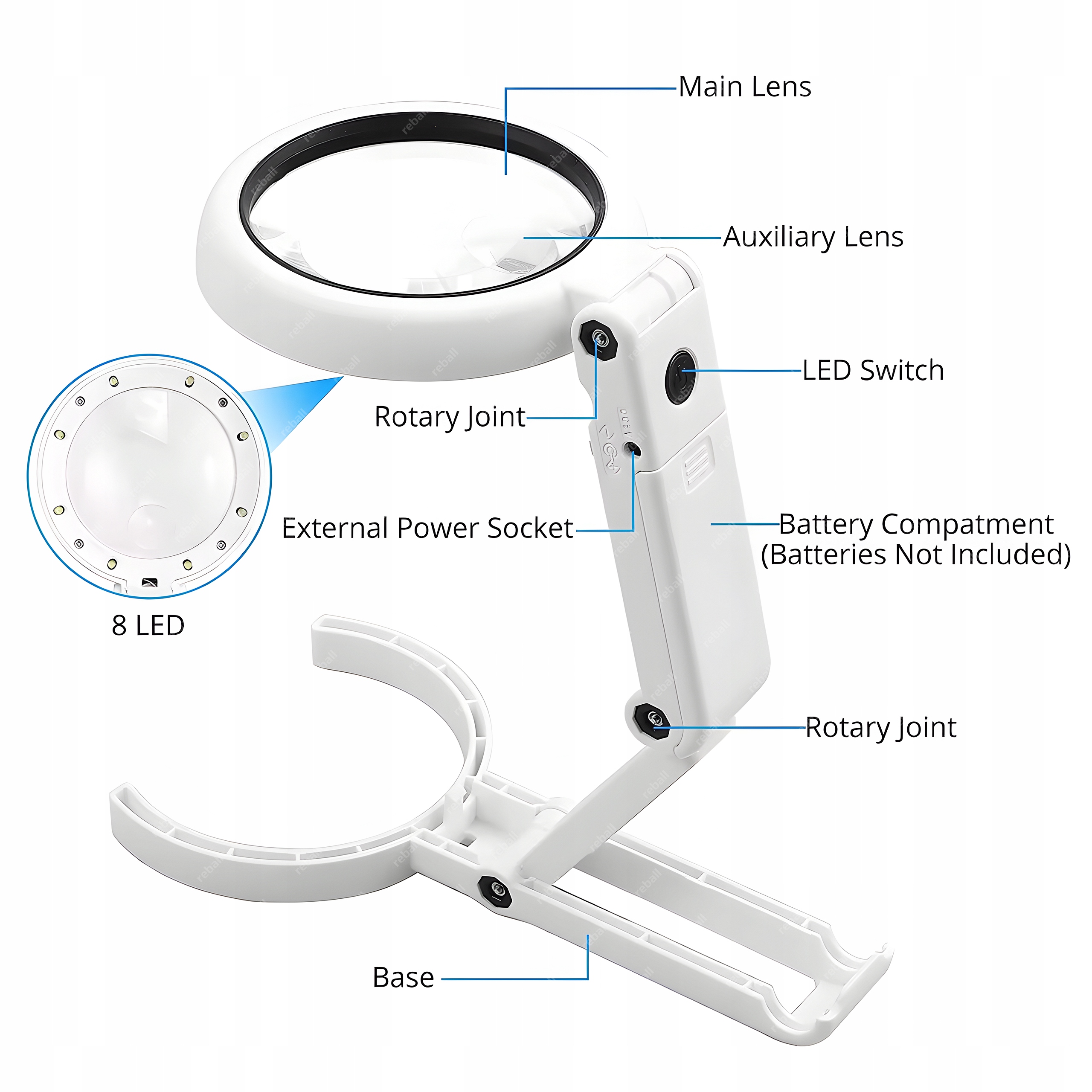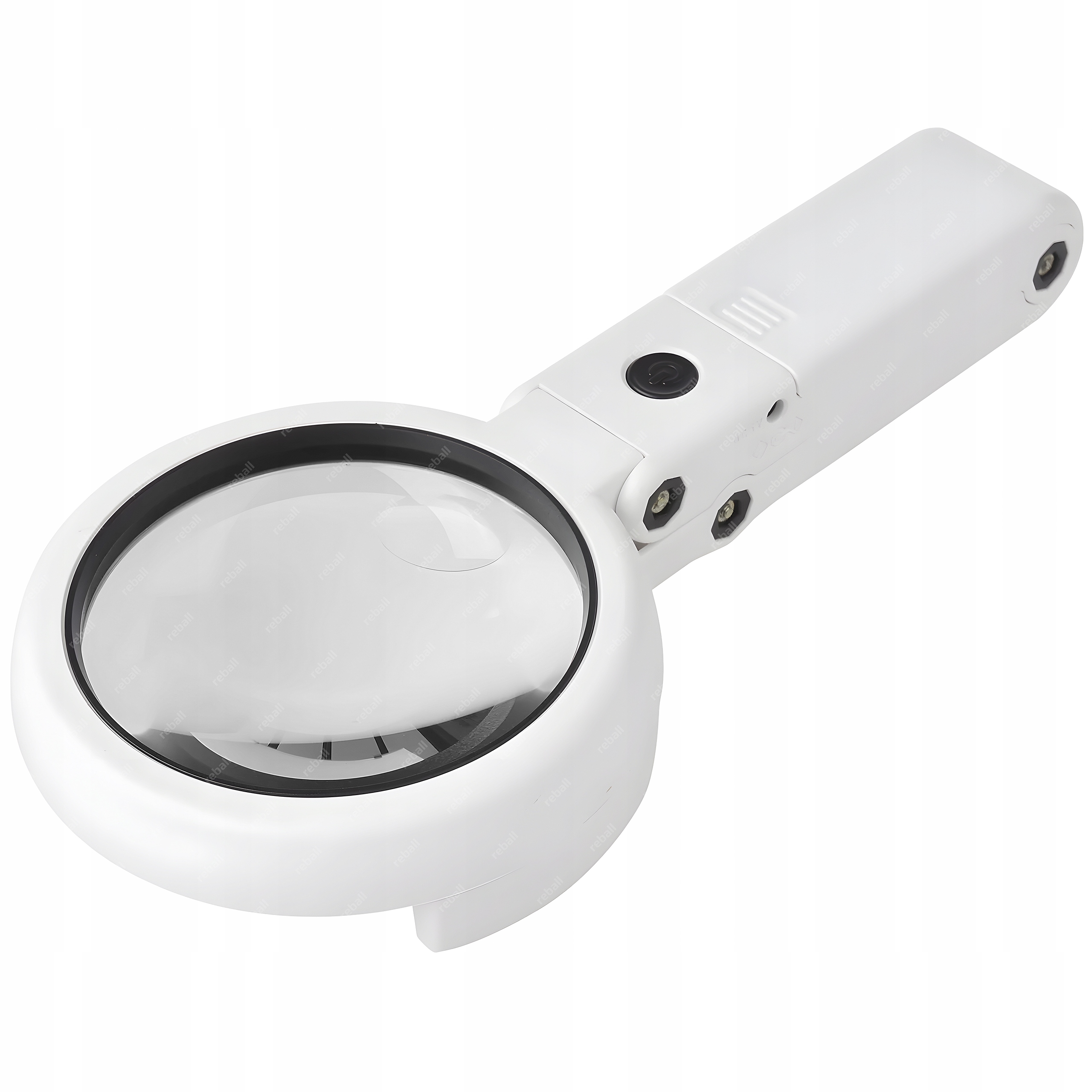 Lupa wyposażona jest w 8 diod LED, które zapewniają równomierne i jasne oświetlenie, umożliwiając wygodną obserwację nawet w ciemniejszych warunkach. Dodatkowo, urządzenie posiada dwa poziomy jasności, co pozwala dostosować intensywność światła do indywidualnych potrzeb i warunków otoczenia. Dzięki temu użytkownik może precyzyjnie analizować szczegóły w słabym świetle, a diody LED charakteryzują się długą żywotnością i energooszczędnością, co zapewnia długotrwałą i efektywną pracę.