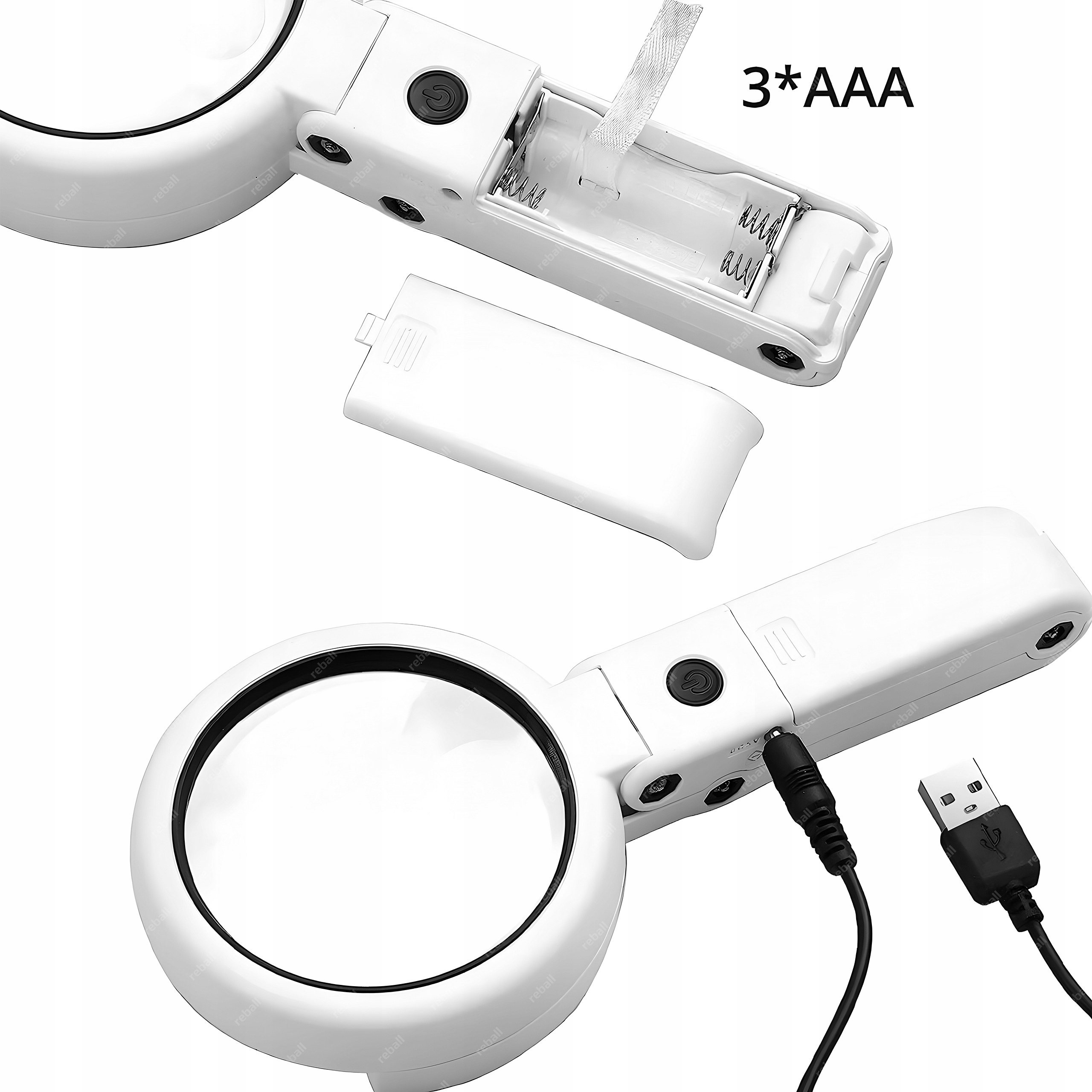 Lupa może być zasilana trzema bateriami AAA (brak w zestawie) lub przez dedykowane wejście DC za pomocą dołączonego kabelka USB.