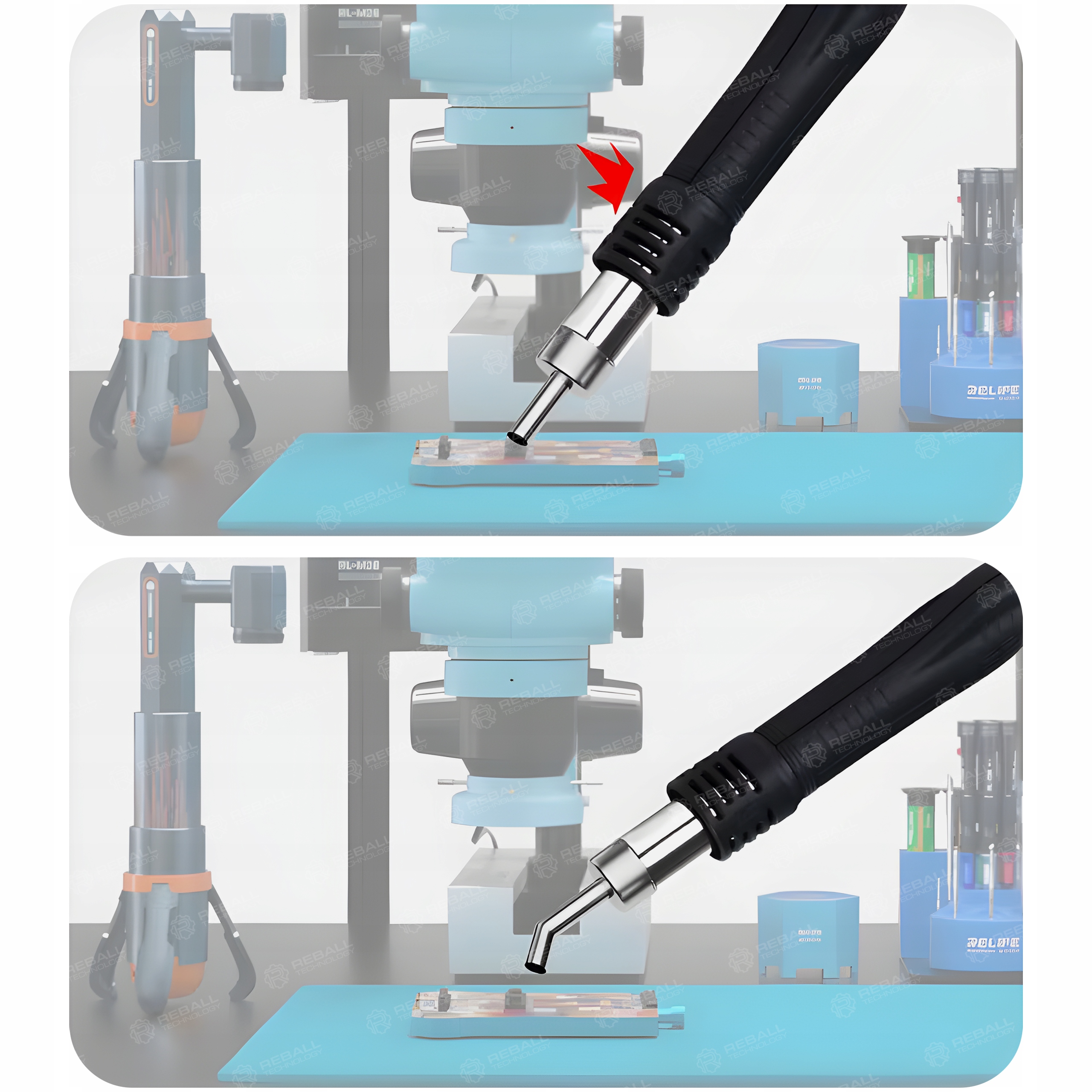 Kąt 45° poprawia widoczność pola roboczego i ułatwia lutowanie oraz rozlutowywanie drobnych elementów SMD i BGA bez zasłaniania naprawianego obszaru.