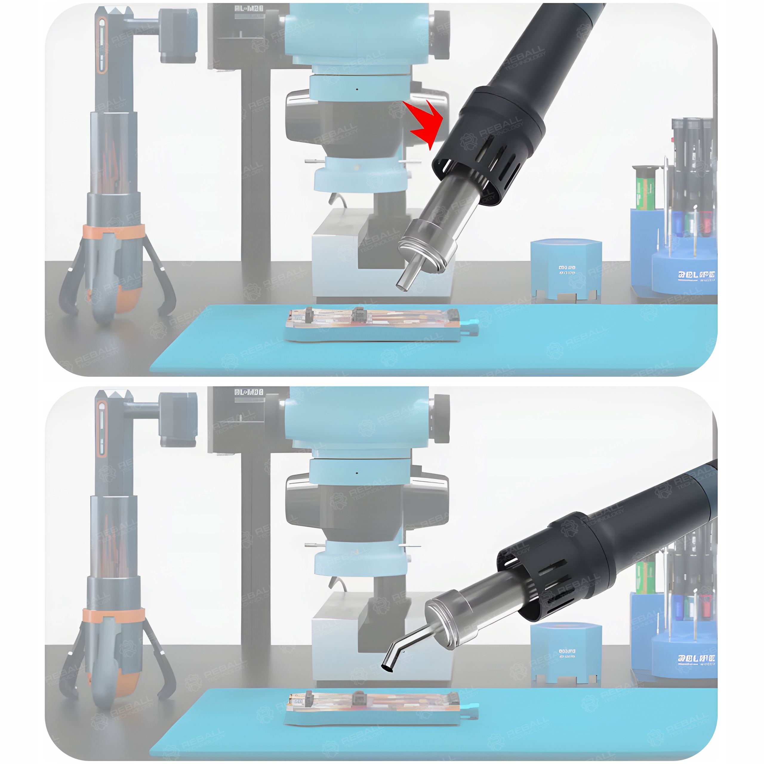 Kąt 45° poprawia widoczność pola roboczego i ułatwia lutowanie oraz rozlutowywanie drobnych elementów SMD i BGA bez zasłaniania naprawianego obszaru.