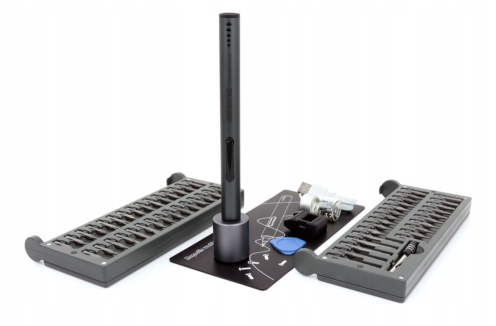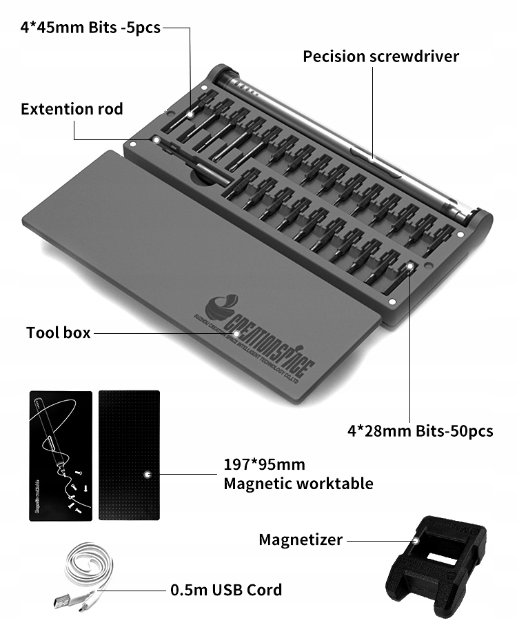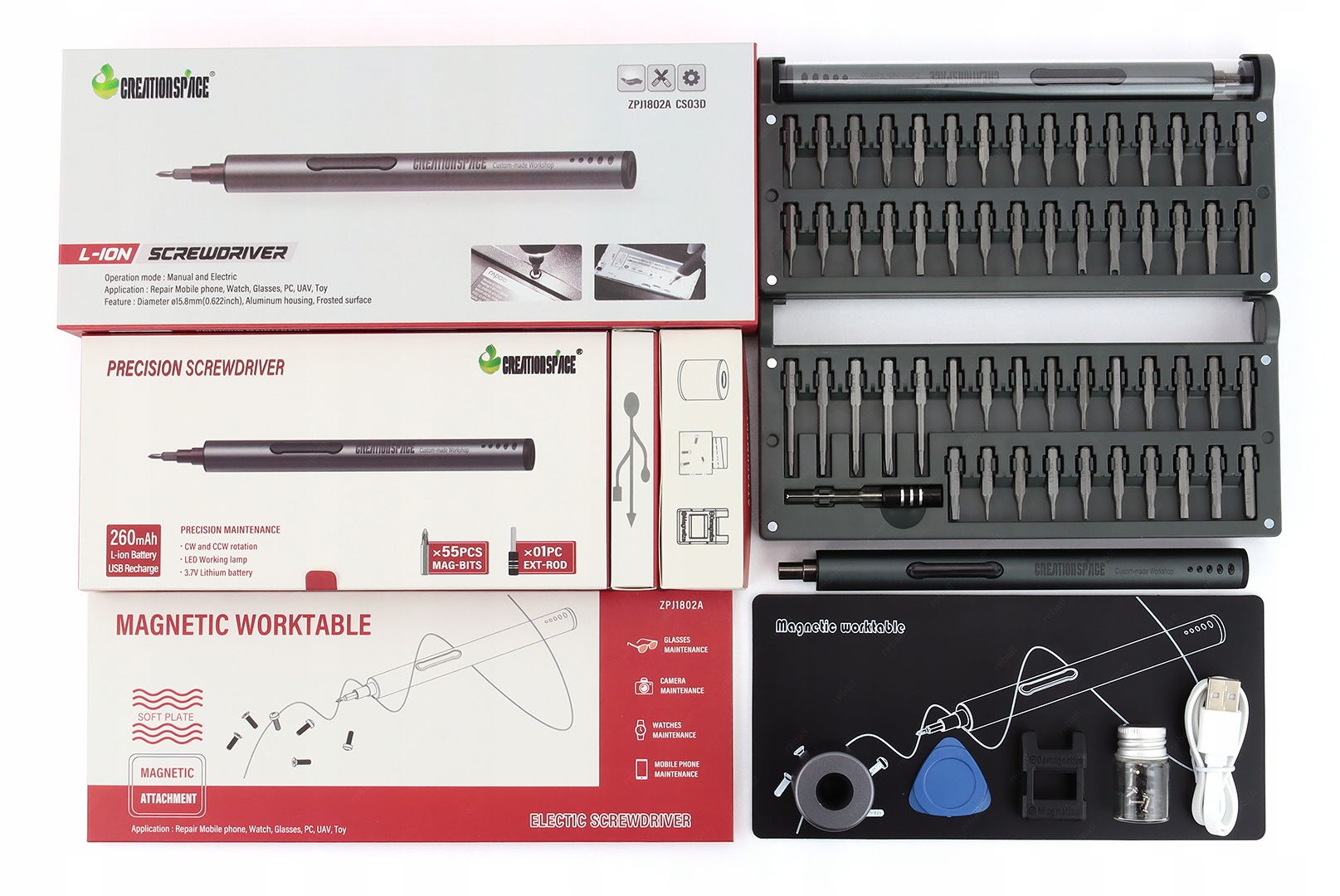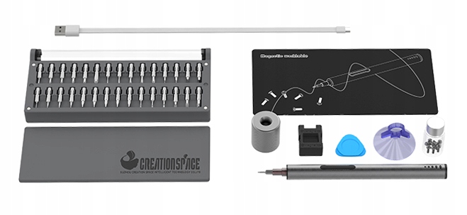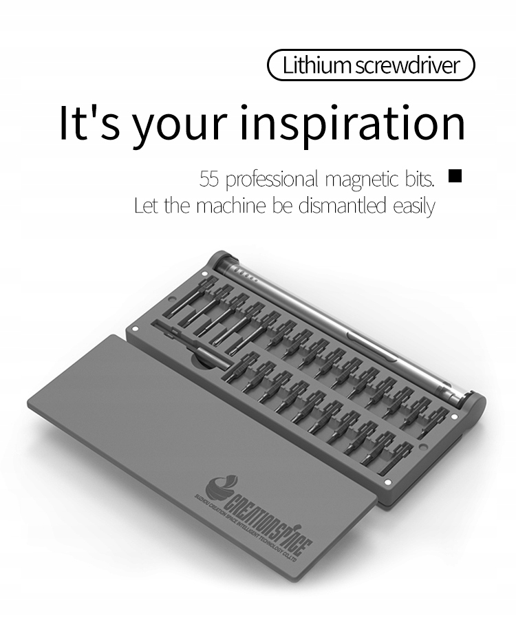 Niezawodny bezprzewodowy wkrętak CREATIONSPACE ZPJ1802A CS03D z wydajnym akumulatorem 260mAh oraz 55 bitami i zestawem 10 dodatkowych akcesorii.