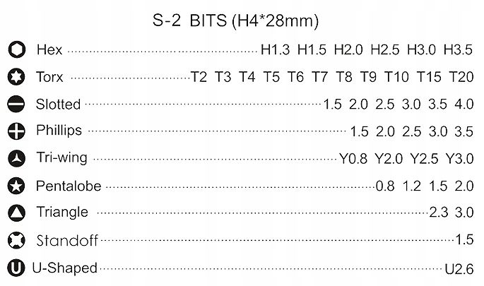 W zestawie znajduje się 40 bitów o długości 28mm: