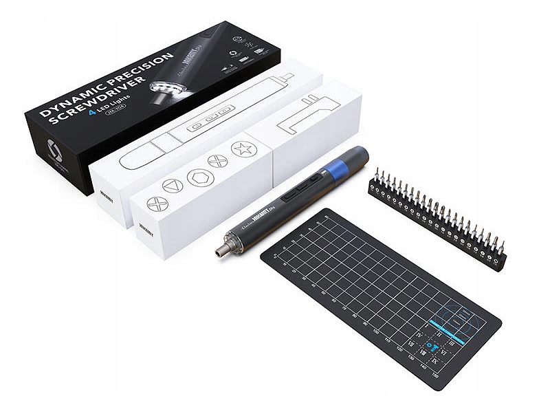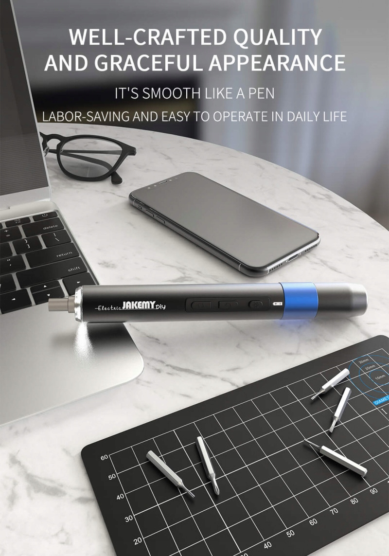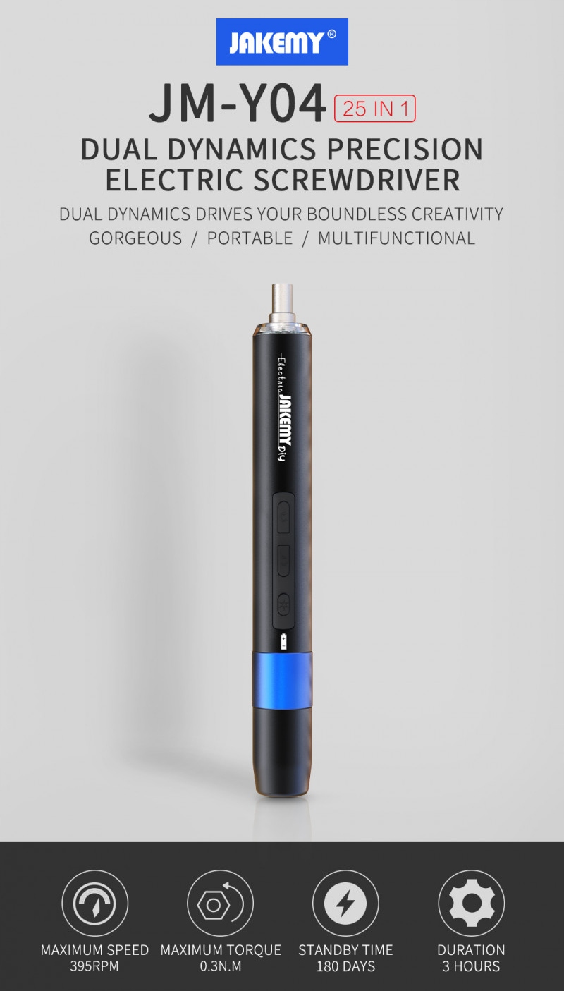 Niezawodny bezprzewodowy wkrętak JAKEMY JM-Y04 z wymiennym akumulatorem Li-Ion 800mAh, oświetleniem LED ładowarką, mata magnetyczną na śrubki oraz 21 bitami.