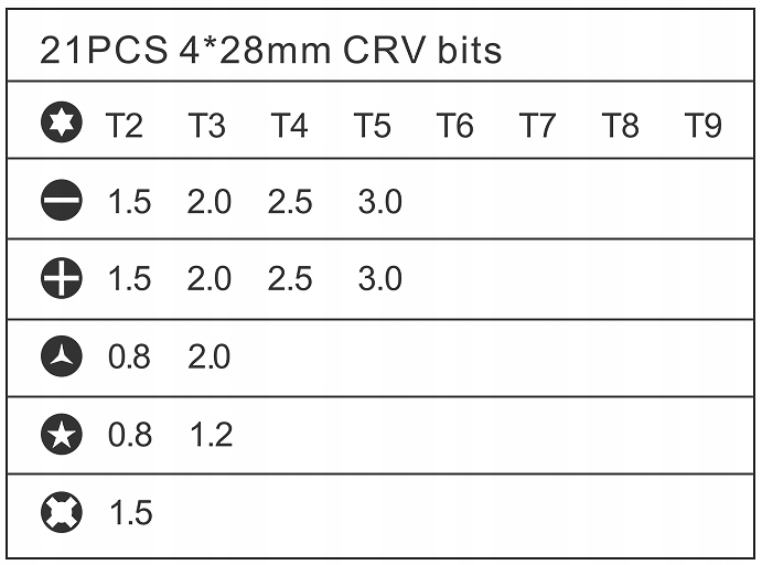 W zestawie znajdują się 21 bitów o długości 28mm: