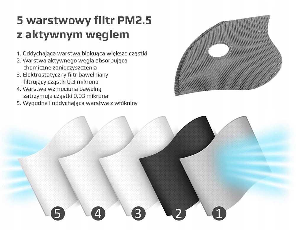 Filtr KN95 PM2.5 FFP2 HEPA z węglem aktywnym oraz wkładką modelującą na nos (tylko u nas!).