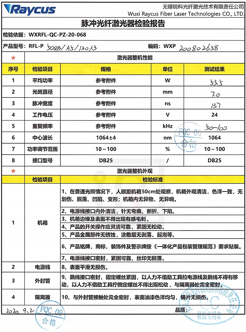 Z urządzeniem otrzymasz raport testowy sporządzany dla każdego egzemplarza modułu lasera przez firmę Raycus.