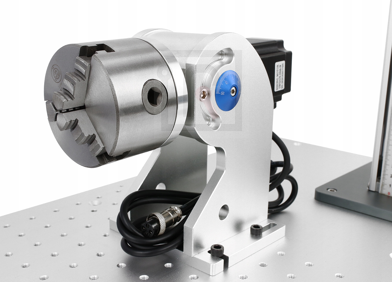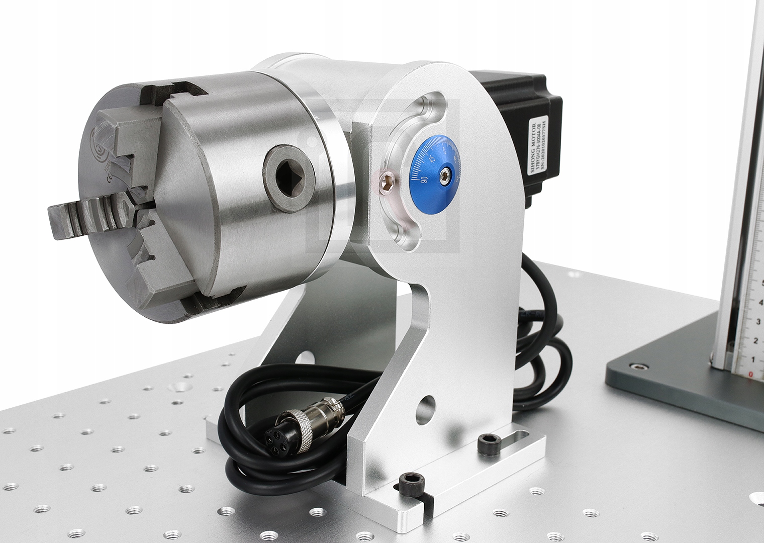 Stół posiada obrotnicę dzięki której jest możliwość grawerowania na elementach okrągłych w tym pod kątem (regulacja kąta obrotnicy).