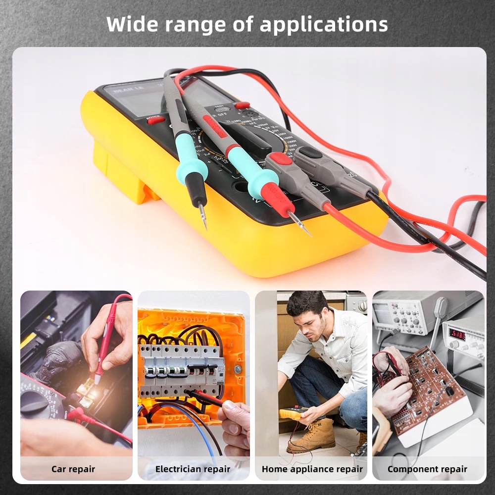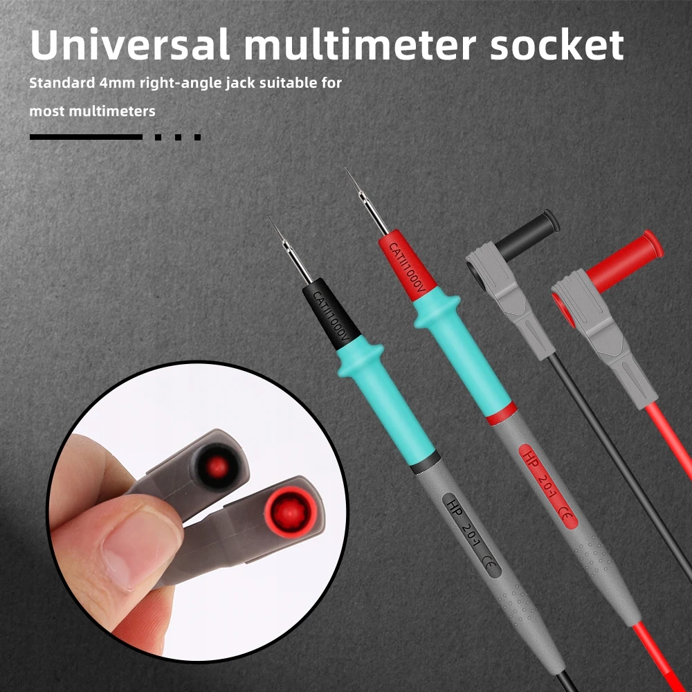 Bardzo dobrze i solidnie wykonane precyzyjne przewody pomiarowe przeznaczone do wszystkich mierników, multimetrów wyposażonych w standardowe gniazda bananowe. Kable pasują do każdego miernika z gniazdami bananowymi.