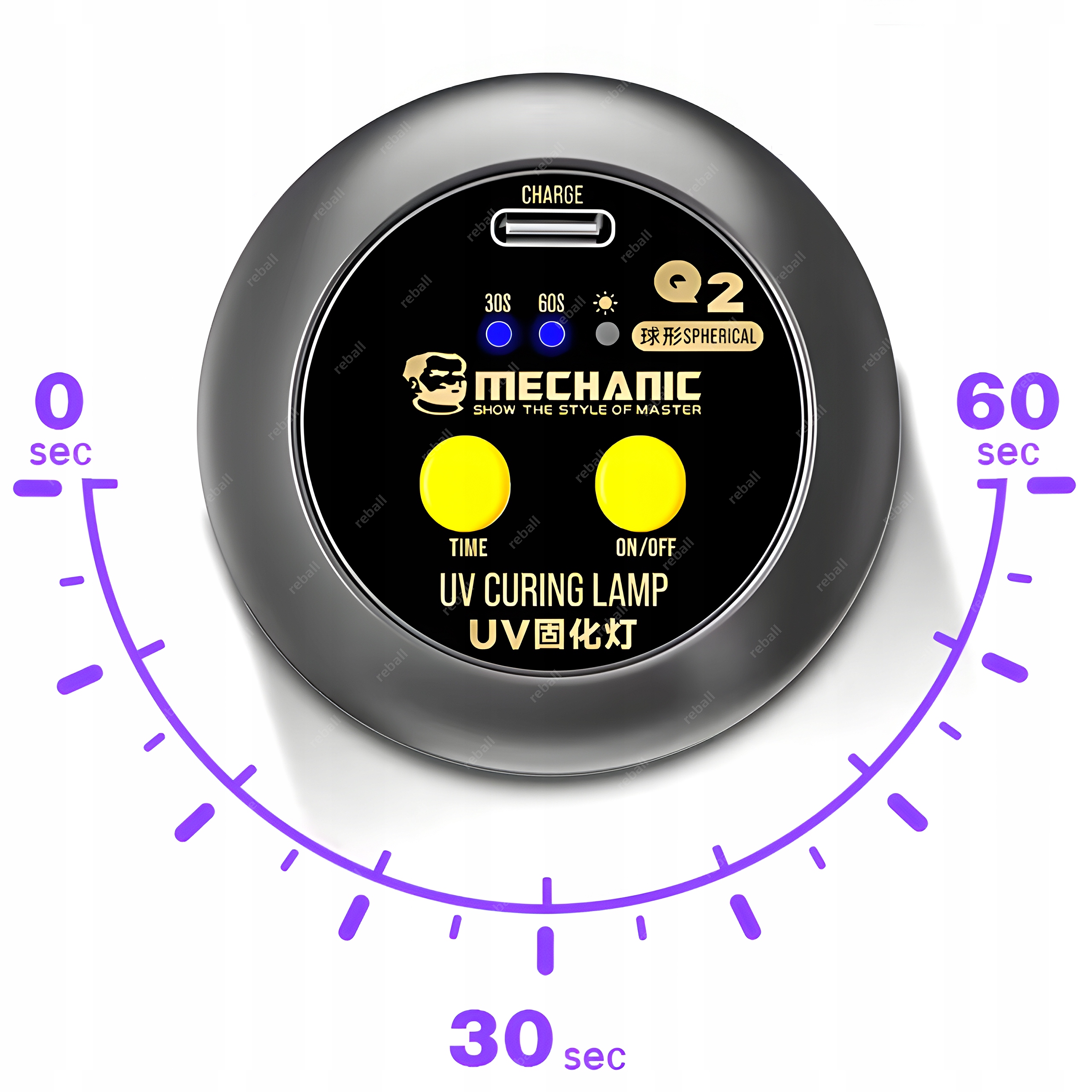 Mechanic Q2 posiada funkcję timera umożliwiająca na ciągłe korzystanie z lampy lub przełączenie się pomiędzy dwoma trybami działania - 30 sekundowym lub 60 sekundowym.