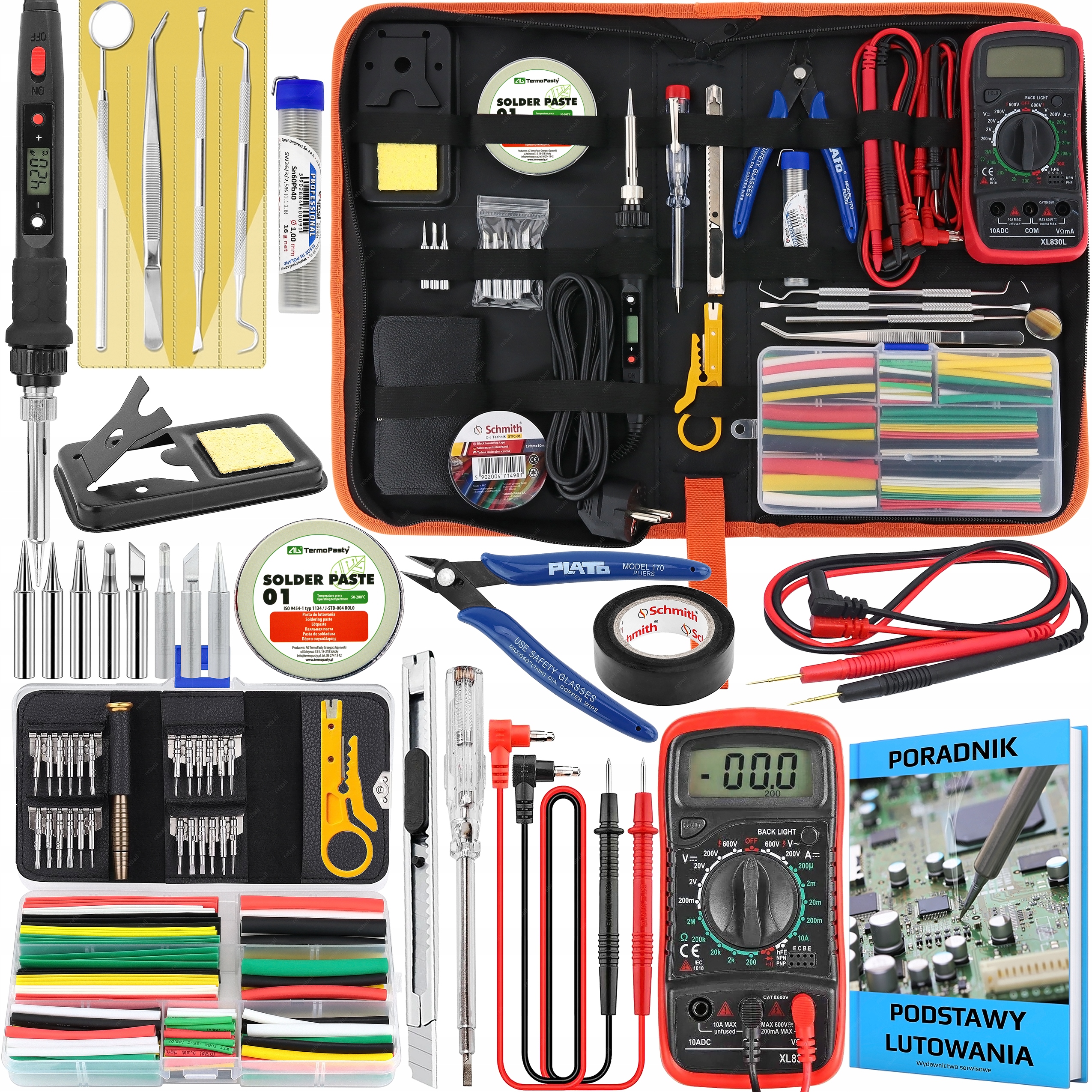 Oto co wyróżnia ten zestaw - mocna firmowa lutownica S801A 80W, miernik cyfrowy, polska cyna Cynela i pasta lutownicza AG TP oraz dobrze dobrany zestaw niezbędnych akcesoriów lutowniczych, zamknięty w praktycznym, pojemnym etui - organizerze.