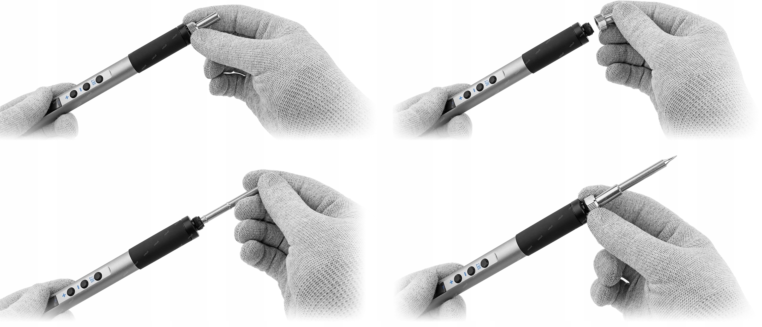 Wymiana grota w tej lutownicy jest niezwykle prosta i nie wymaga żadnych specjalistycznych narzędzi. Wystarczy delikatnie odkręcić obecny grot i zamocować nowy. Mechanizm mocowania jest solidny i pewny, co gwarantuje, że grot pozostaje stabilnie osadzony podczas pracy. To oznacza, że możesz bez obaw przystąpić do lutowania różnych elementów w szybki i wygodny sposób.