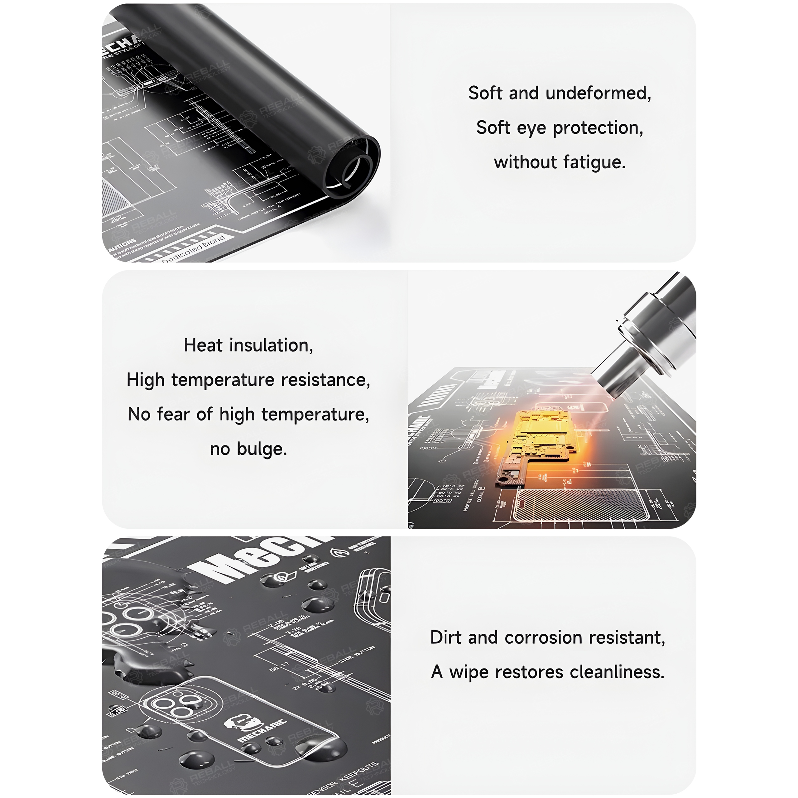Mata została opracowana z myślą o komforcie i bezpieczeństwie użytkownika — antypoślizgowa powierzchnia zapobiega przesuwaniu się komponentów, a odporność termiczna pozwala bezpiecznie pracować z kolbą lutowniczą lub opalarką.
