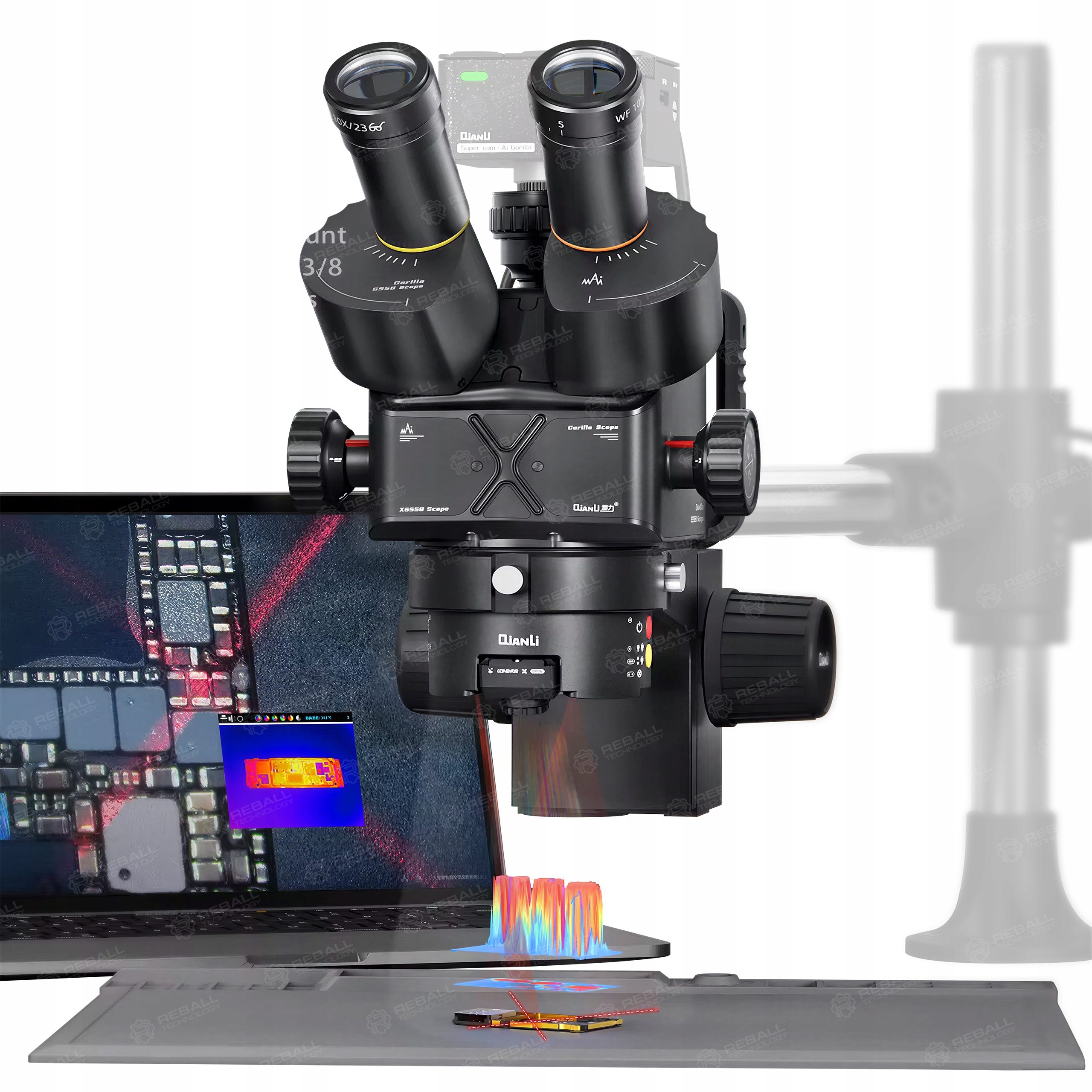 Mikroskop został zaprojektowany z myślą o wygodnej pracy serwisowej pod dużym powiększeniem. Zintegrowany moduł oświetlenia, laserowe pozycjonowanie 3D oraz możliwość instalacji modułu UV i kamery termowizyjnej sprawiają, że QIANLI 6558 dobrze sprawdza się zarówno przy diagnostyce usterek, jak i przy precyzyjnych naprawach układów BGA, CPU i innych elementów SMD.