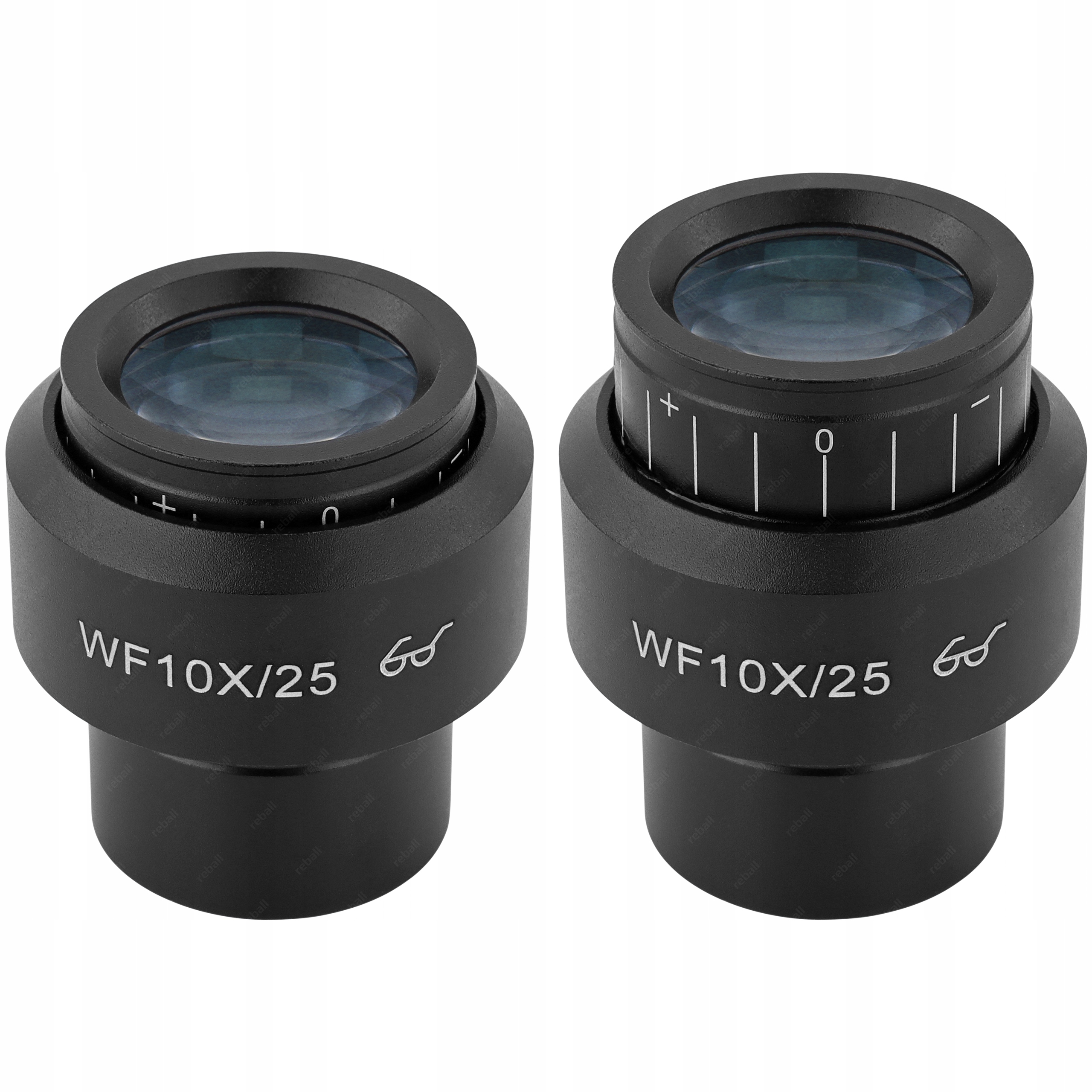 Zestaw okularów mikroskopowych o dziesięciokrotnym powiększeniu i średnicy obsady 25mm.