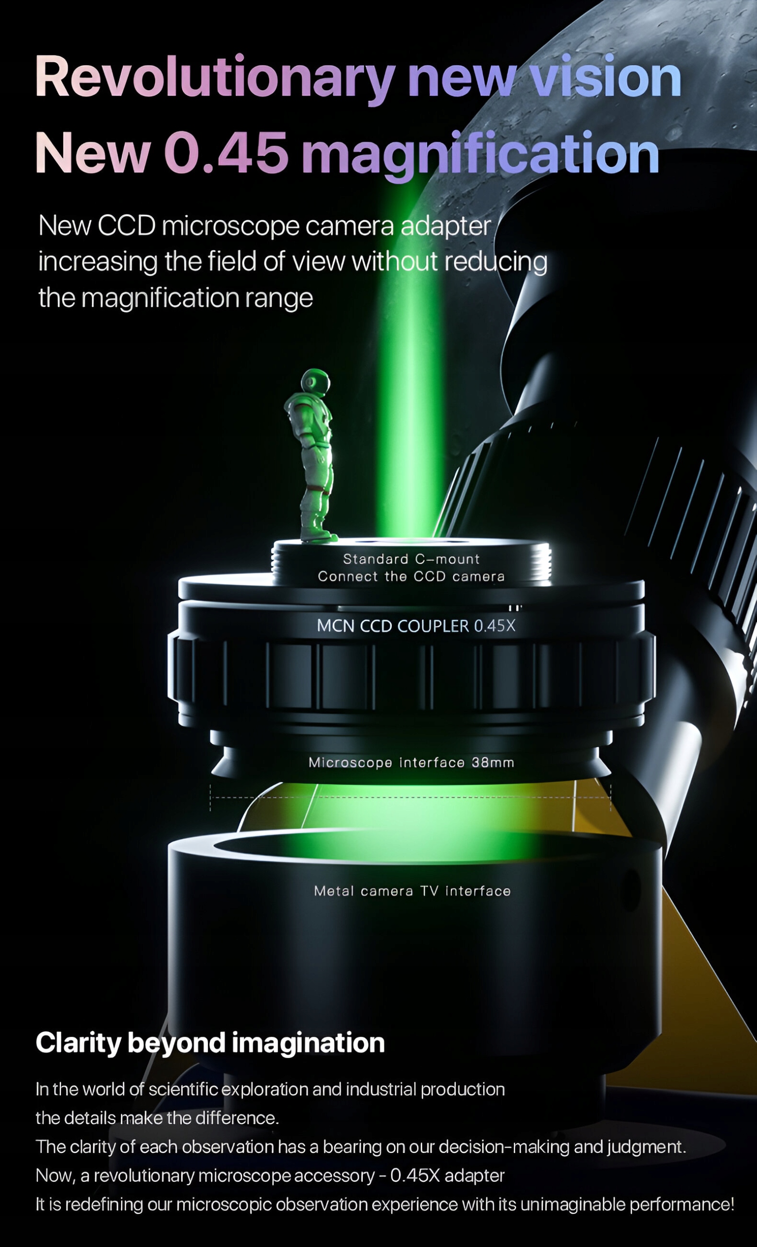 Adapter/konwerter C-Mount MCN (0,45x) pozwala przy zastosowaniu kamery o określonej wielkości sensora na akwizycję obrazu o porównywalnej szerokości pola widzenia jak w okularach.