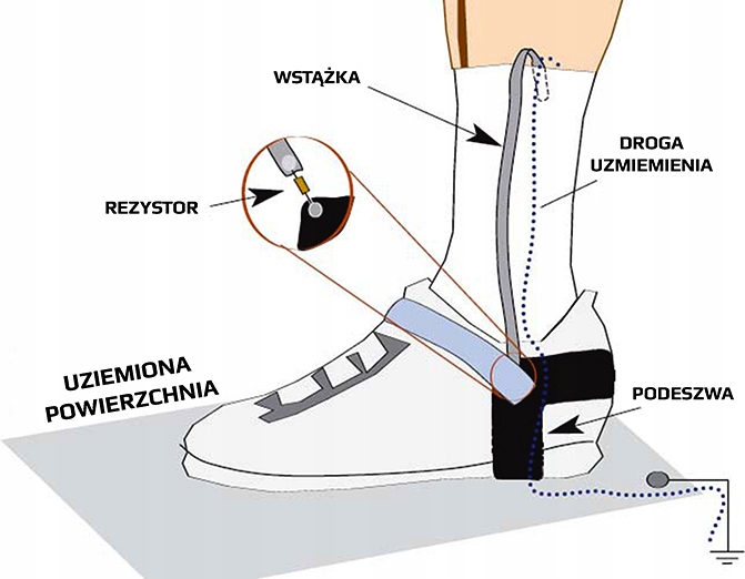 Może służyć również do odprowadzenia wszelkich ładunków z ciała człowieka w przypadku długiej pracy przy komputerze i monitorach ekranowych bądź ich serwisowaniu.