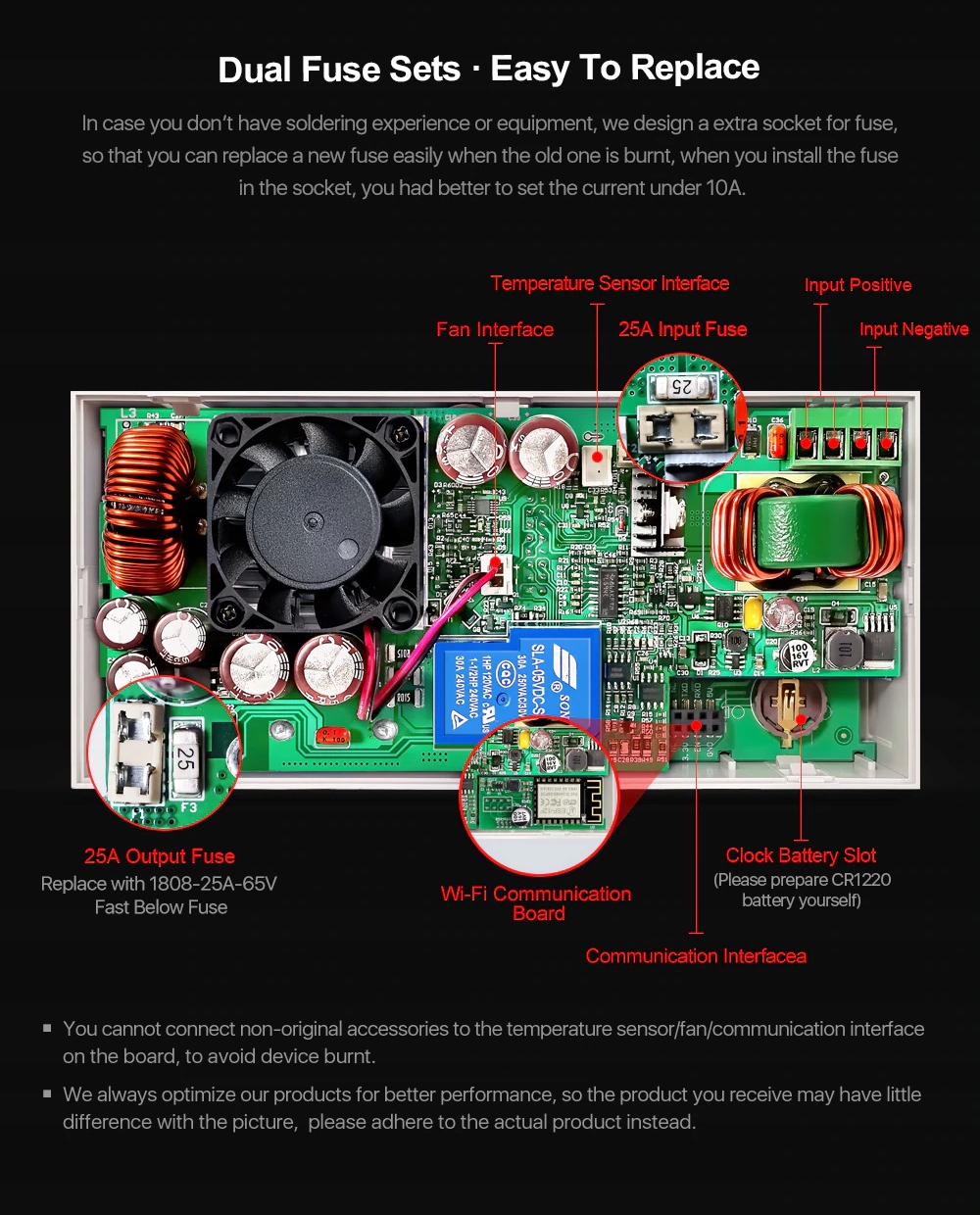 Wbudowany wentylator zapewnia chłodzenie całego układu. Zasilacz posiada również zabezpieczenie przed przeciążeniem, przekroczeniem napięcia oraz przekroczeniem temperatury. Wbudowane bezpieczniki chronią układ przed przekroczeniem dopuszczalnych parametrów na wejściu jak i wyjściu urządzenia.