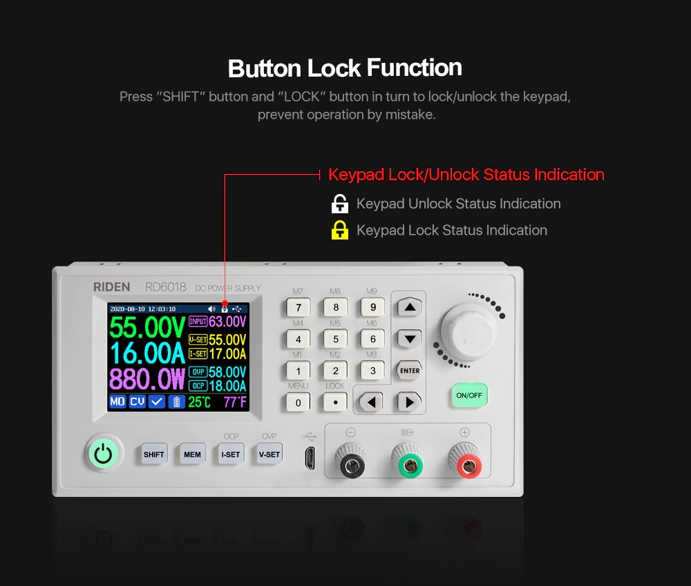 Klawiatura która znajduje się na przednim panelu jest podświetlana (przyciski funkcyjne, nie dotyczy klawiatury numerycznej). Dodatkowo za pomocą przycisków mamy możliwość zabezpieczenia, zablokowania klawiatury uniemożliwiając przypadkową zmianę wartości, parametrów.