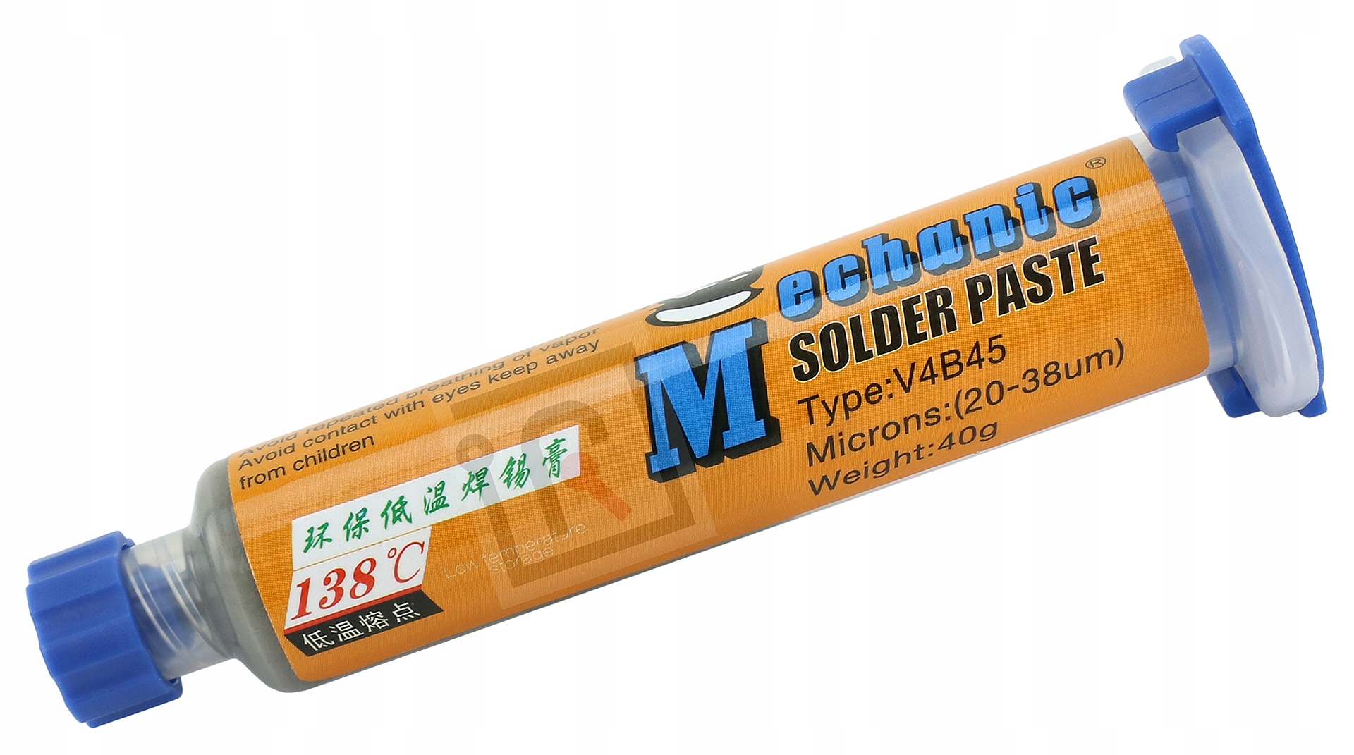 Pasta lutownicza Mechanic V4B45 to specjalny rodzaj niskotopliwej pasty lutowniczej (cyna w formie pasty) przeznaczona do lutowania elementów elektronicznych tj SMD, BGA np. w procesach naprawczych. Dzięki bardzo niskiej temperaturze topnienia wynoszącej dokładnie 138°C stosowanie pasty w takim procesie umożliwia wykonanie skomplikowanych napraw (np. obsadzanie procesora CPU w iPhone) bez narażenia pozostałych podzespołów telefonu na uszkodzenia mogące być wynikiem konieczności osiągania w bezołowiowym procesie lutowniczym temperatury 217°C.
