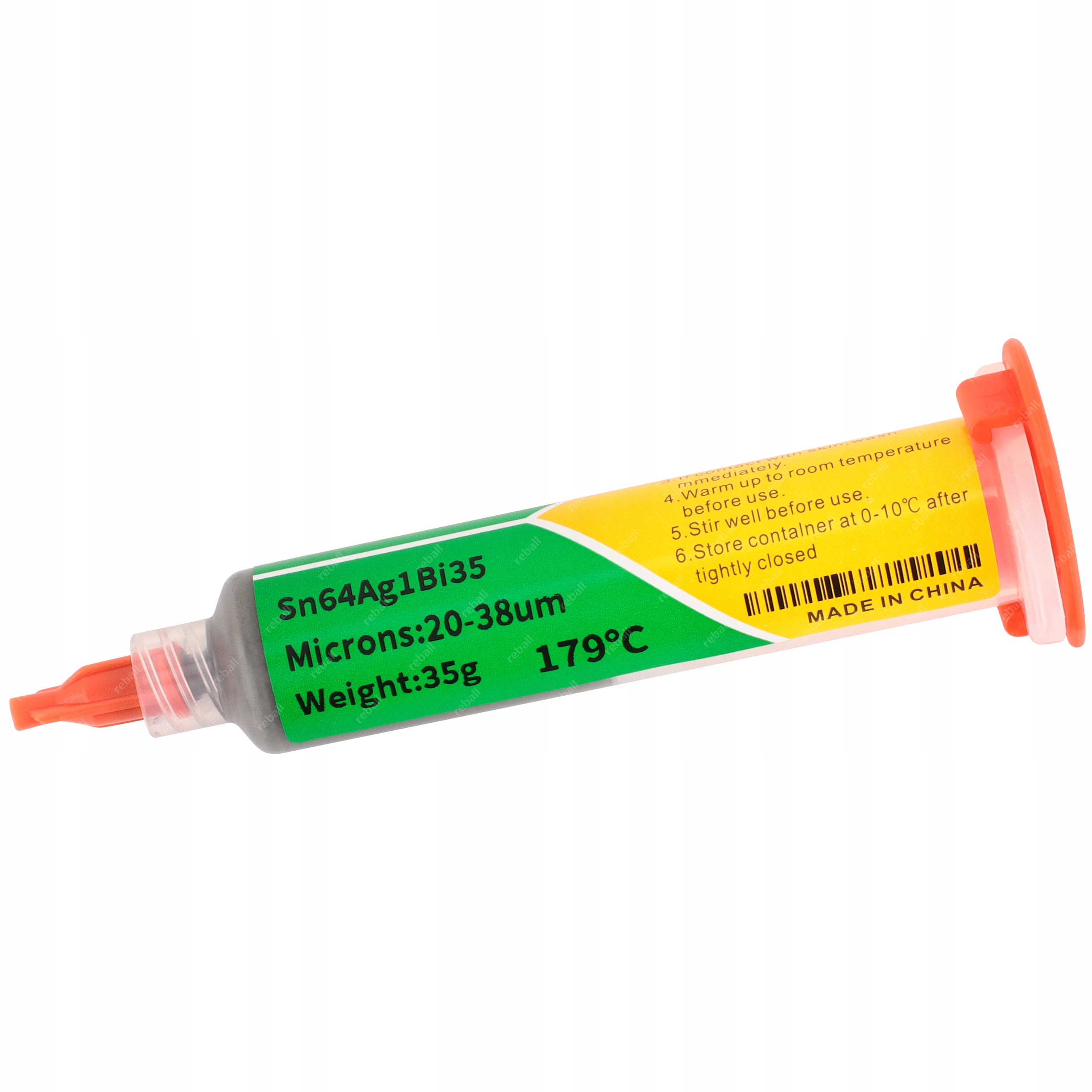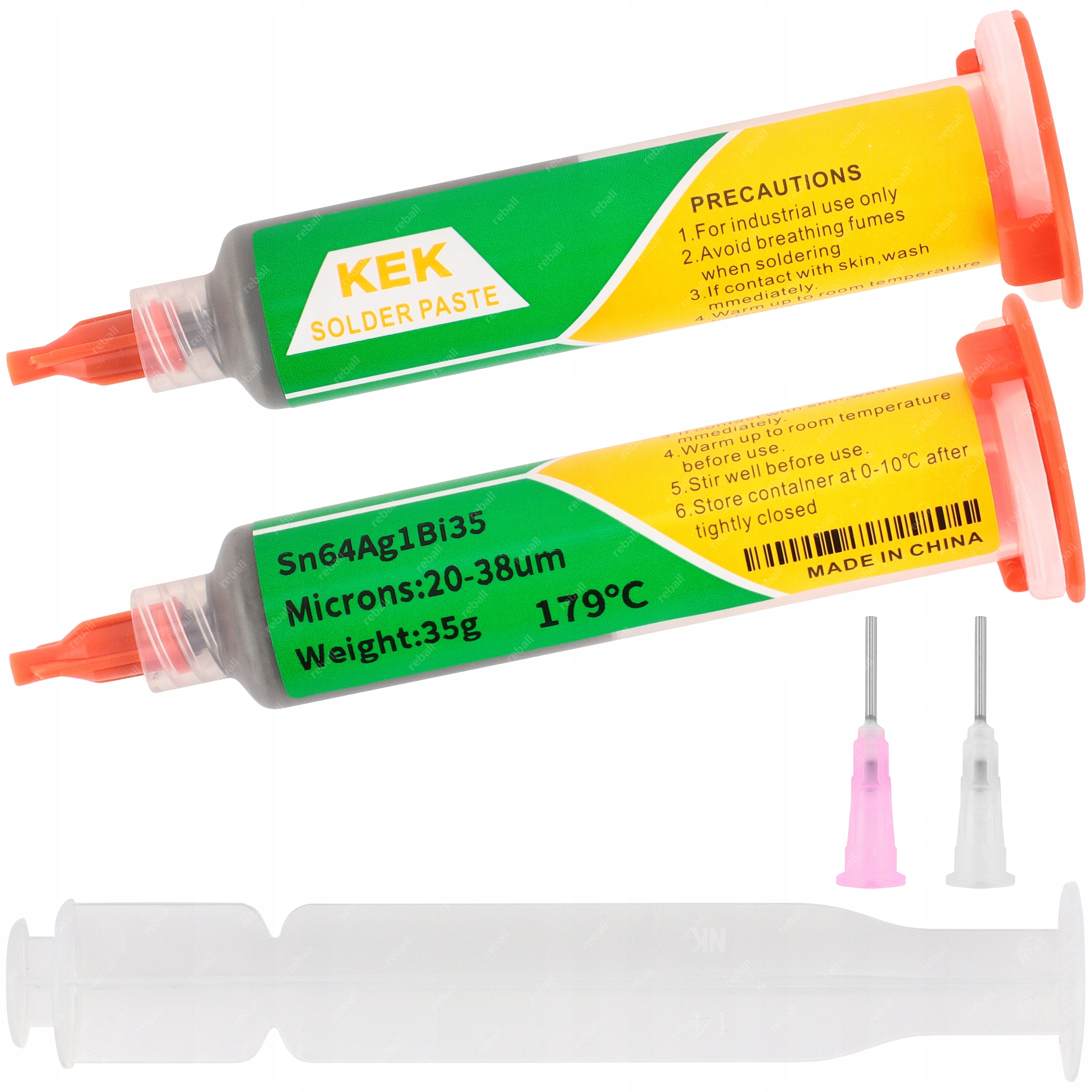 Pasta KEK Sn64Ag1Bi35 (z zawartością ołowiu) to "płynna cyna" stosowana do lutowania małych i trudno dostępnych elementów SMD oraz wymiany spoiwa na układach BGA.