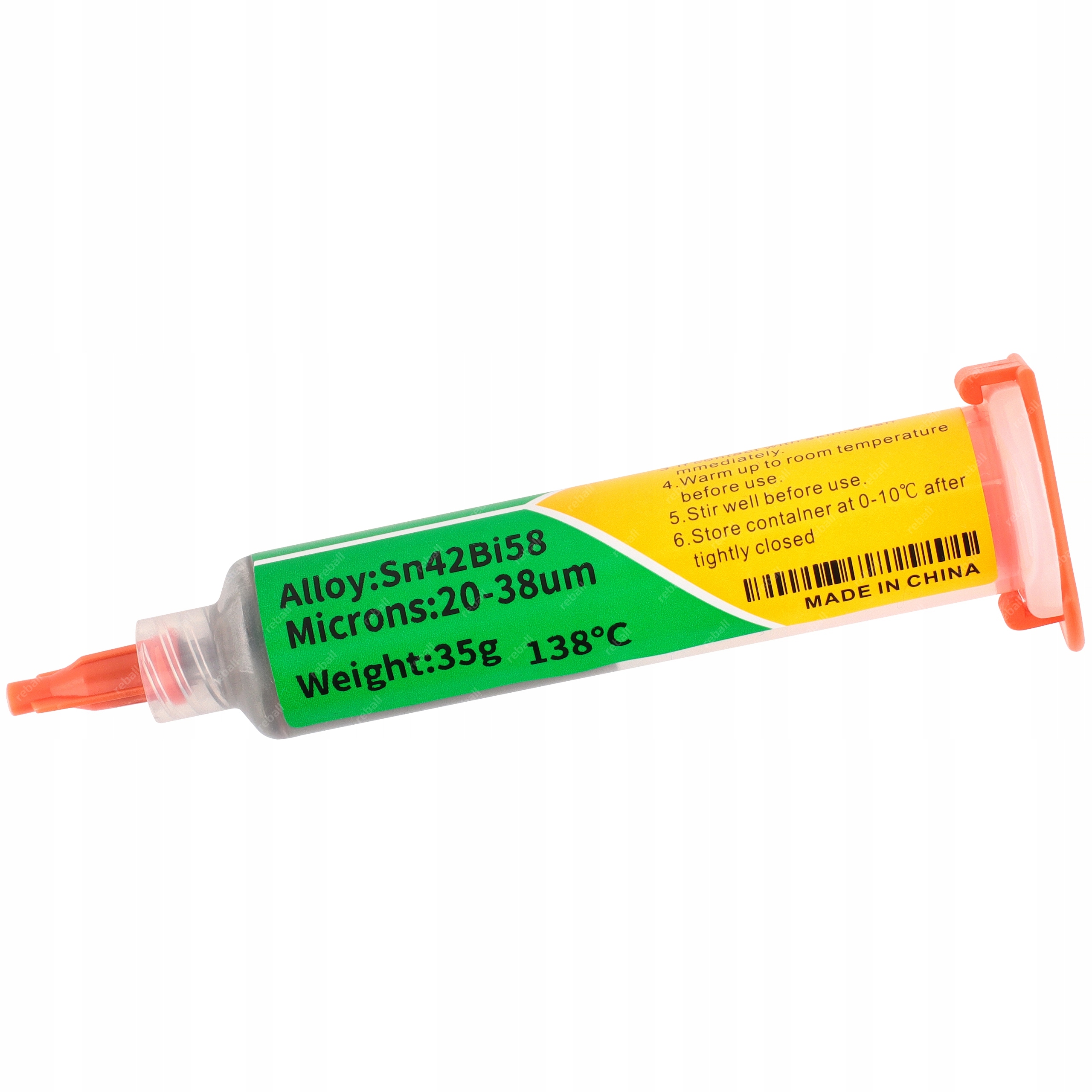 Pasta KEK Sn42Bi58 (z zawartością ołowiu) to "płynna cyna" stosowana do lutowania małych i trudno dostępnych elementów SMD oraz wymiany spoiwa na układach BGA.