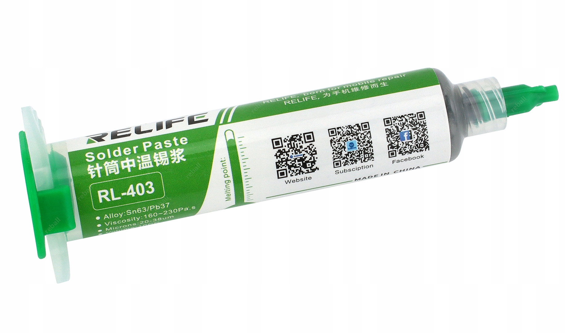 Pasta lutownicza RELIFE FL-403 Sn63/Pb37 (z zawartością ołowiu) to "płynna cyna" stosowana do lutowania małych i trudno dostępnych elementów SMD oraz wymiany spoiwa na układach BGA.