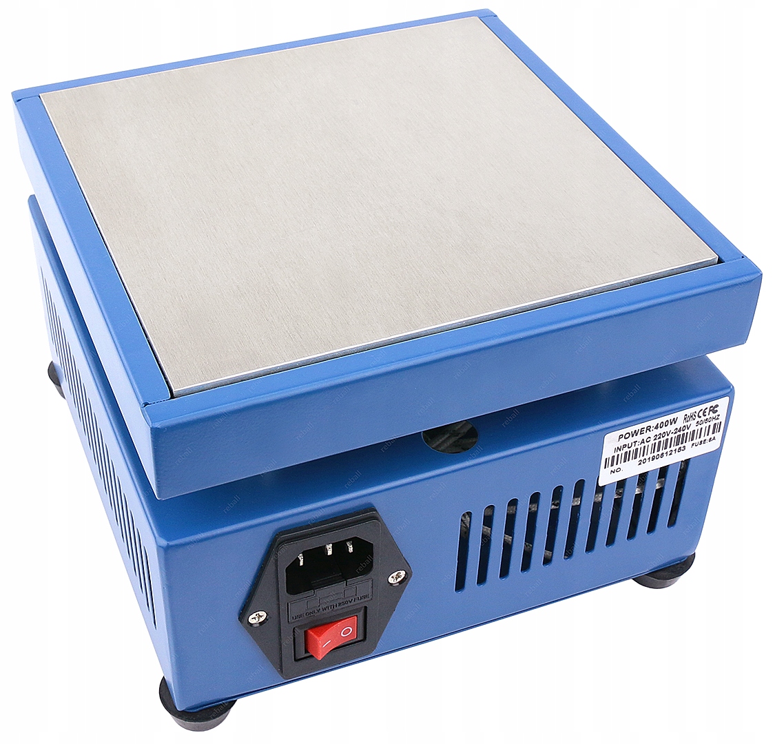 Podgrzewacz posiada grubą płytę grzewczą wykonaną ze stopu aluminium. Dzięki zastosowaniu aluminium uzyskujemy precyzyjną kontrolowaną przez sterownik temperaturę ze stałą jej wartością w czasie (zmniejszenie wahań temperatury i wpływu otoczenia do minimum). Przekłada się to to na powtarzalność procesu jak i zmniejsza do minimum możliwość przegrzania i uszkodzenia układów BGA.