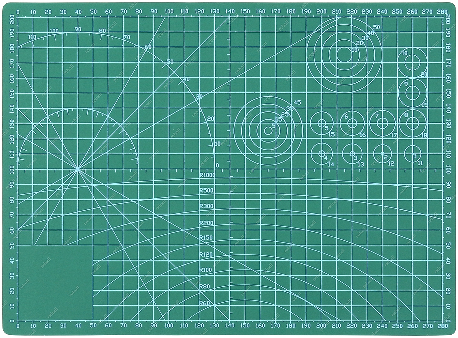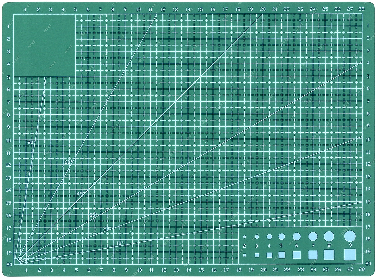 Mata posiada nadrukowane podziałki do precyzyjnego cięcia, kąty oraz miarkę metryczną.