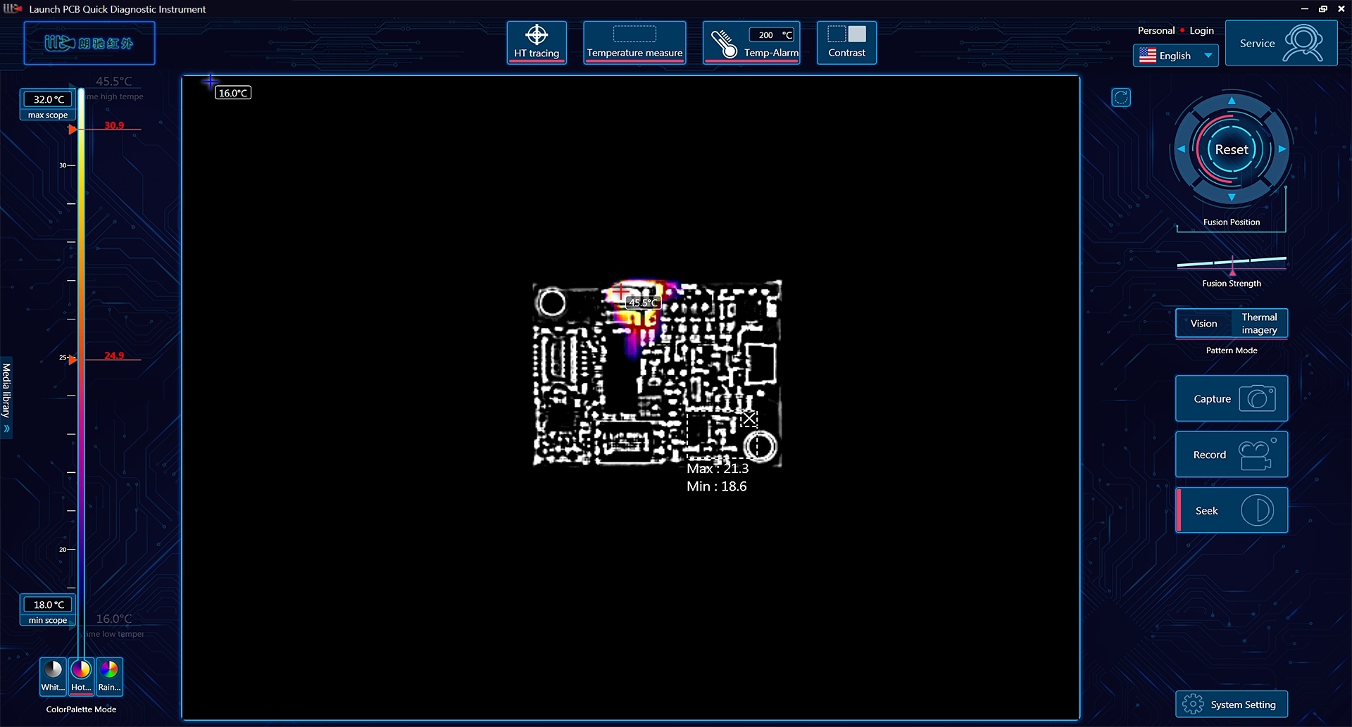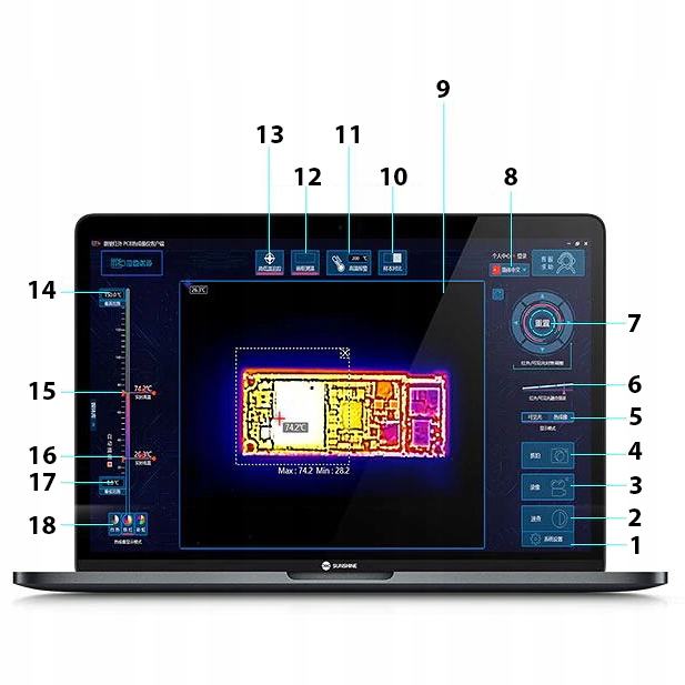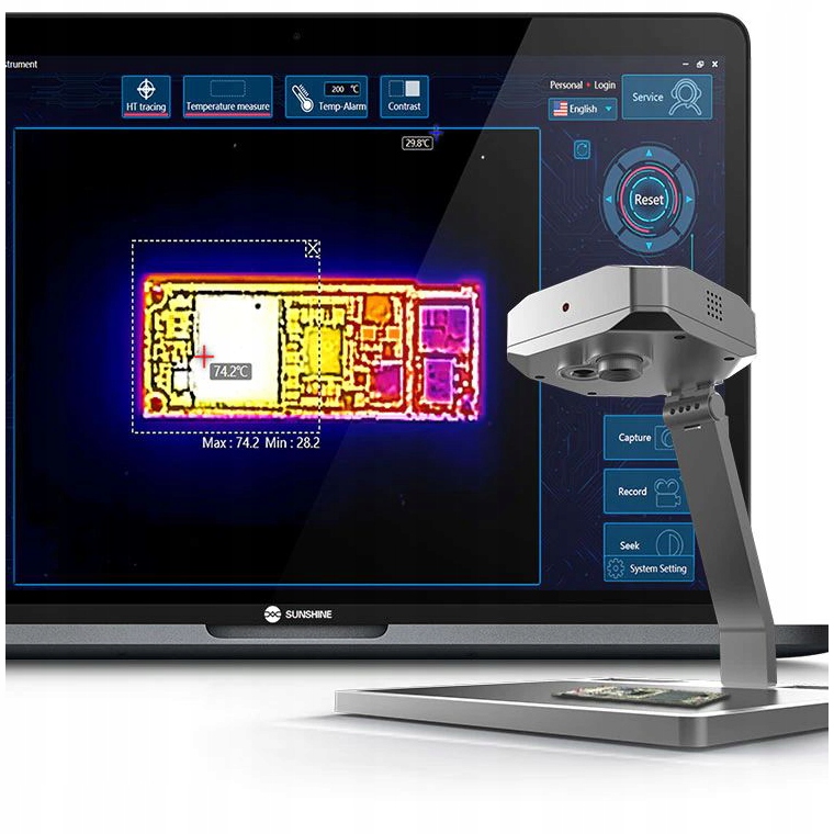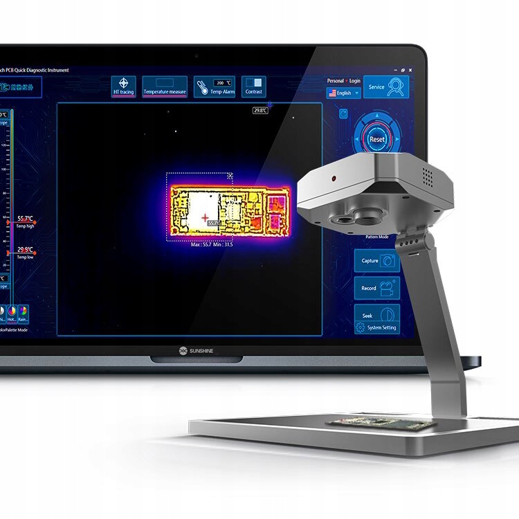 Dzięki wydajnemu oprogramowaniu do inteligentnej analizy obrazu po stronie PC, zastosowaniu inteligentnych algorytmów, kamera podaje temperaturę roboczą dowolnego elementu płyty głównej na żywo oraz wskazuje różnice temperatur w jej obszarach.