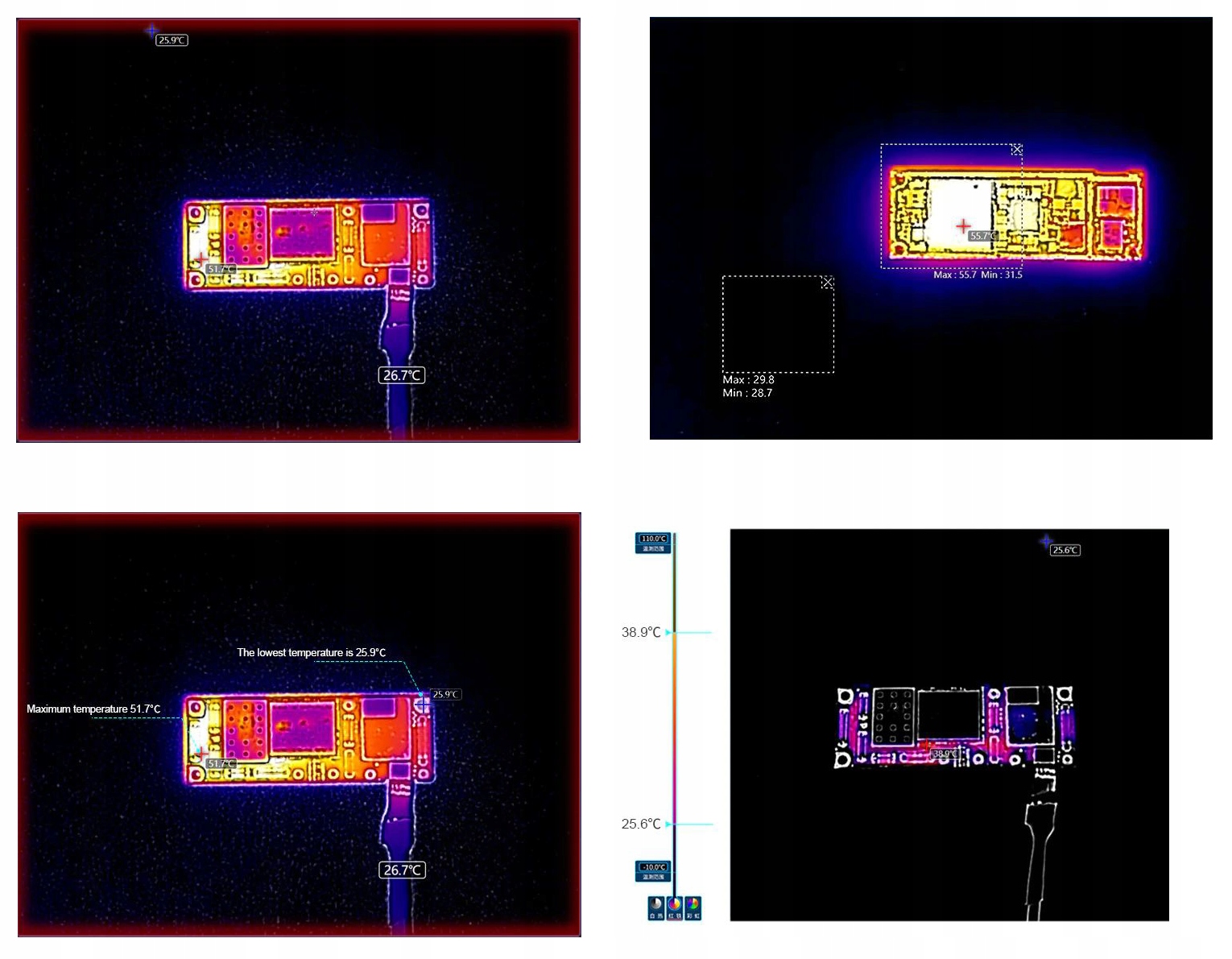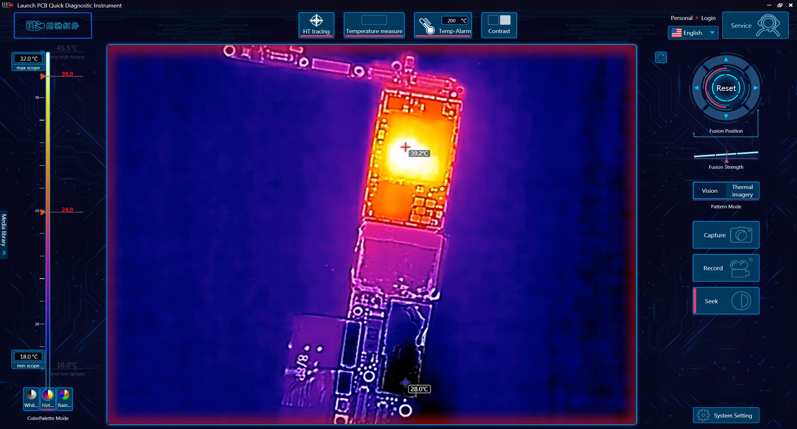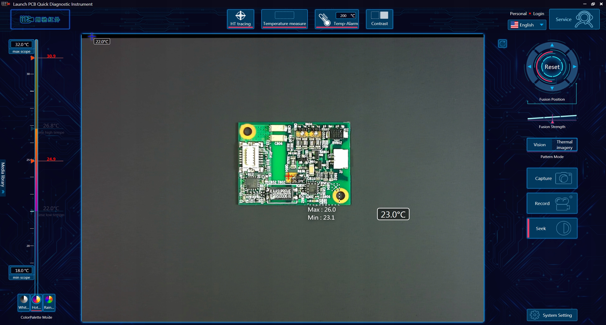 Dzięki wydajnemu oprogramowaniu do inteligentnej analizy obrazu po stronie PC, zastosowaniu inteligentnych algorytmów, kamera podaje temperaturę roboczą dowolnego elementu płyty głównej na żywo oraz wskazuje różnice temperatur w jej obszarach.