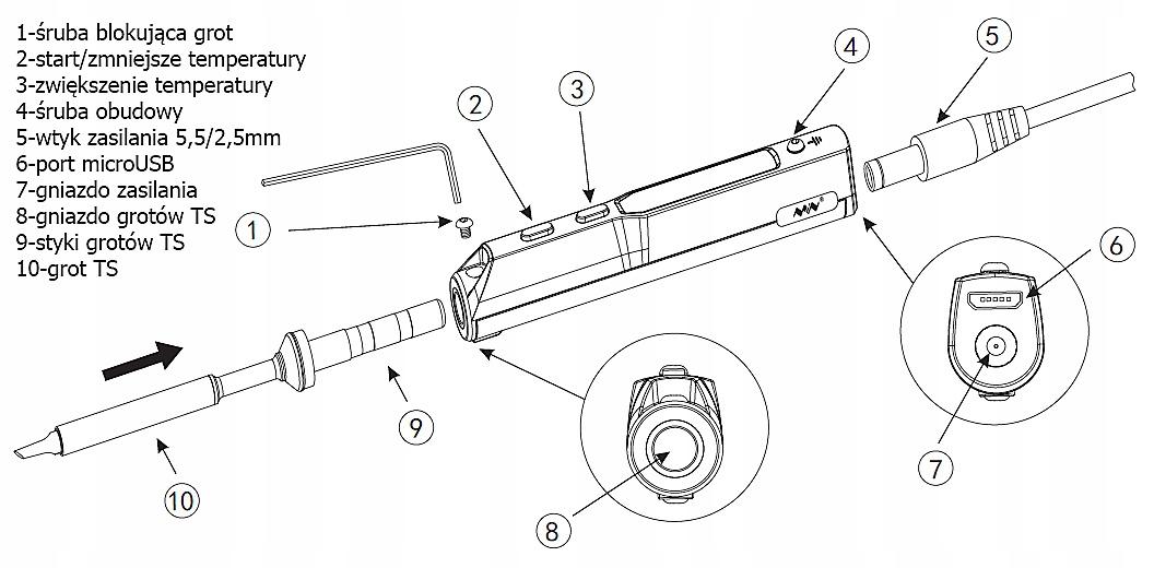 Przedmiotem sprzedaży jest programowalna lutownica MiniDSO TS100 12-24V o mocy 17-65W.