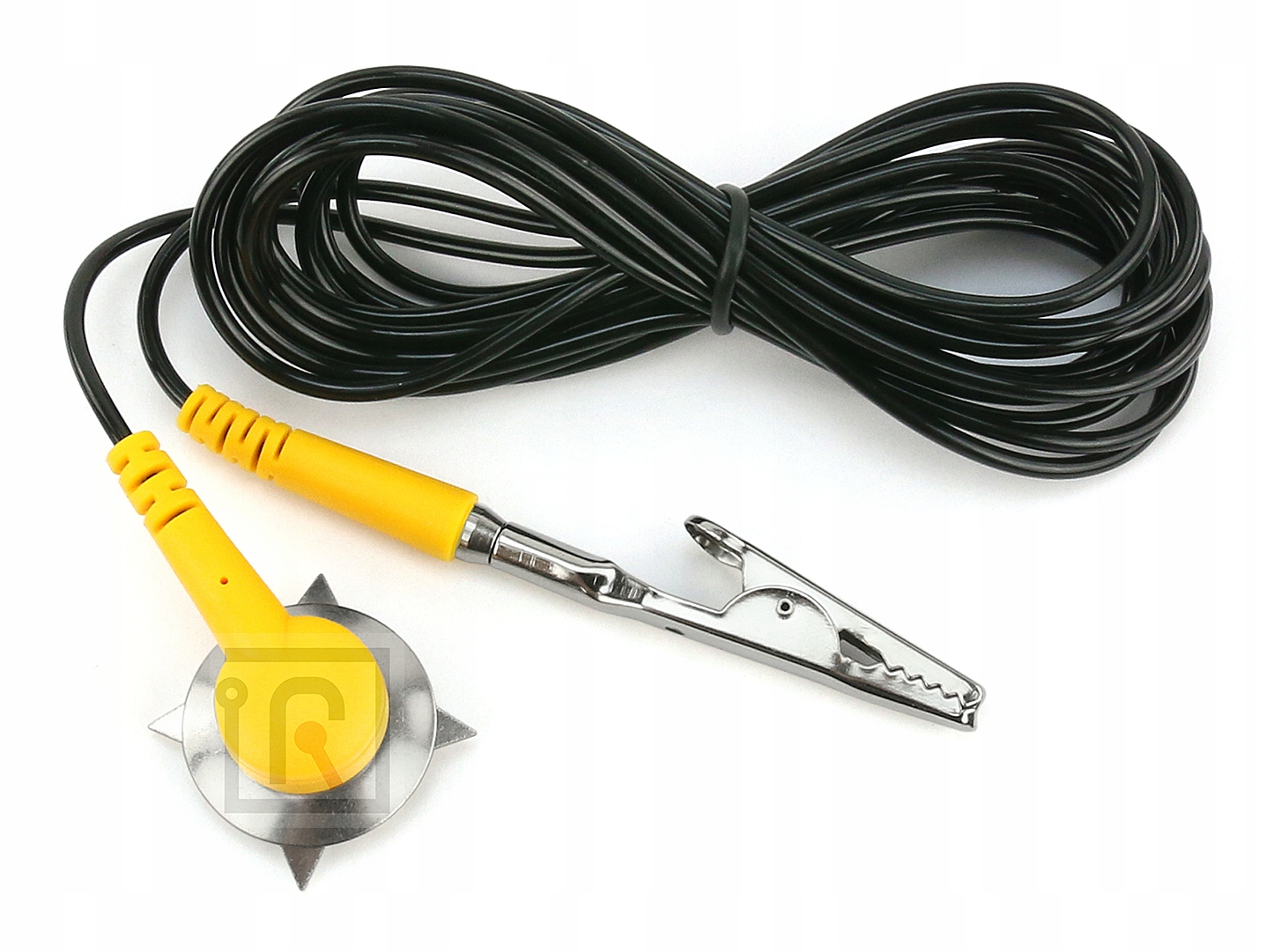 Przewód uziemiający do mat antystatycznych ESD zakończony jest z jednej strony klipsem wpinanym bezpośrednio w matę a z drugiej wtykiem bananowym 4mm z krokodylkiem.