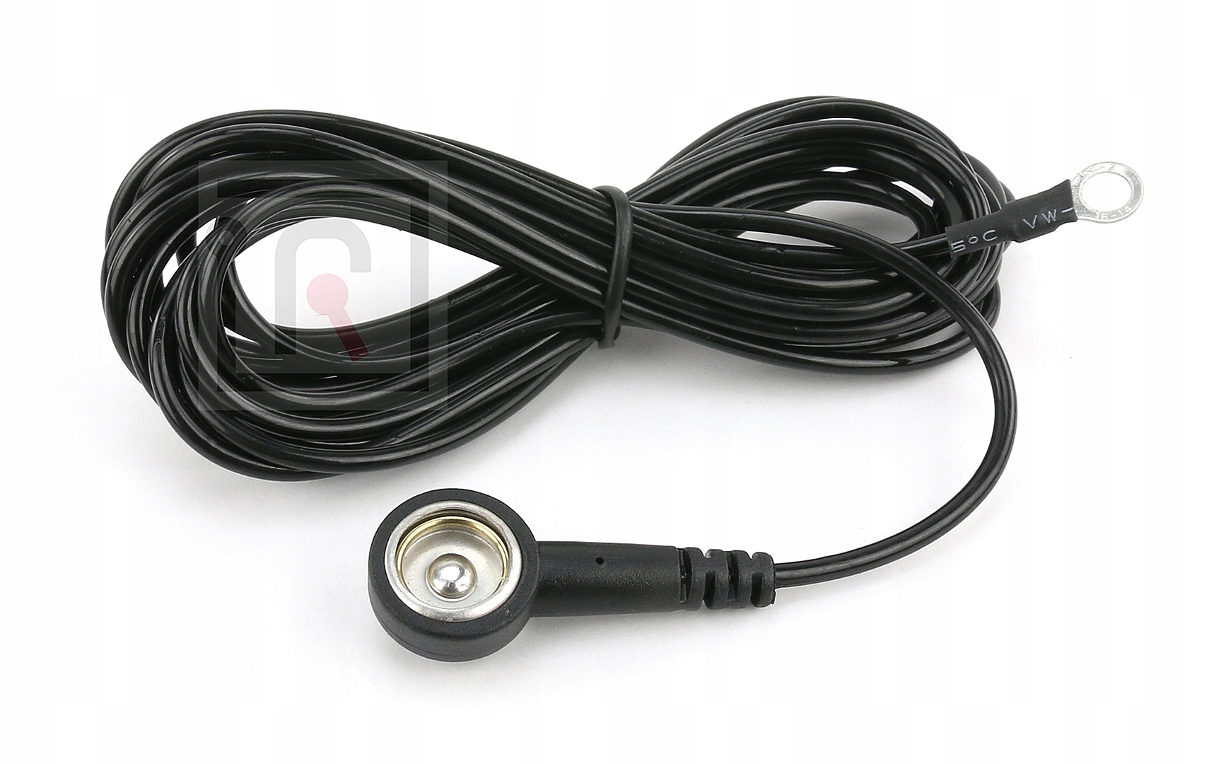 Przewód zakończony z jednej stron zatrzaskową napą 10mm a z drugiej końcówką oczkową o średnicy wewnętrznej 5mm.