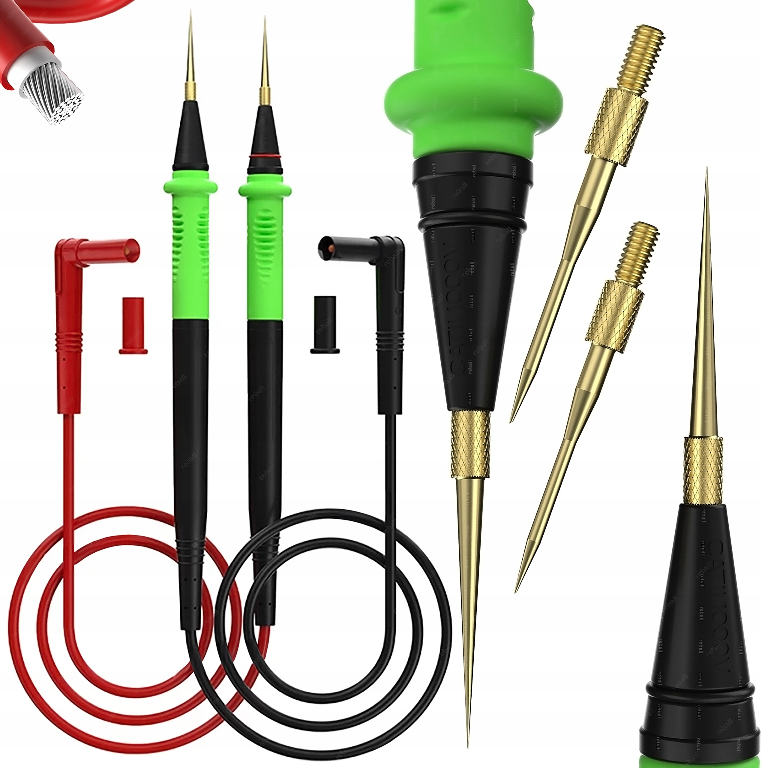 Zestaw zawiera silikonowe przewody pomiarowe/sondy oraz pozłacane wymienne dwa zestawy końcówek.